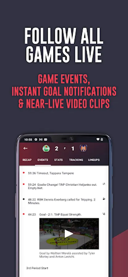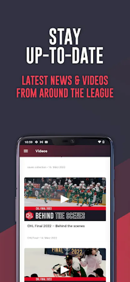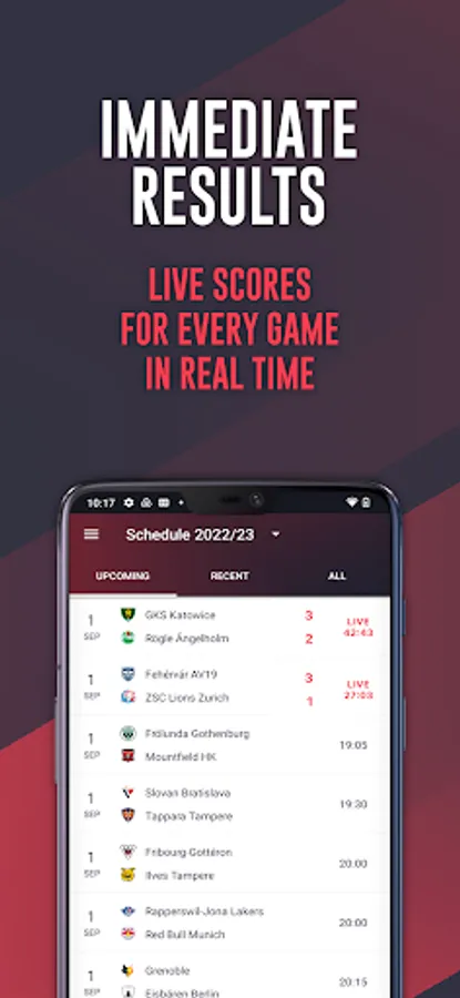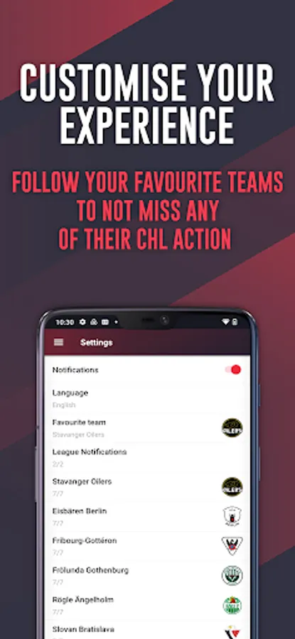 Follow the games with live scores, instant goal notifications and real-time game statistics. Choose your favourite team to not miss any of their action in the CHL.