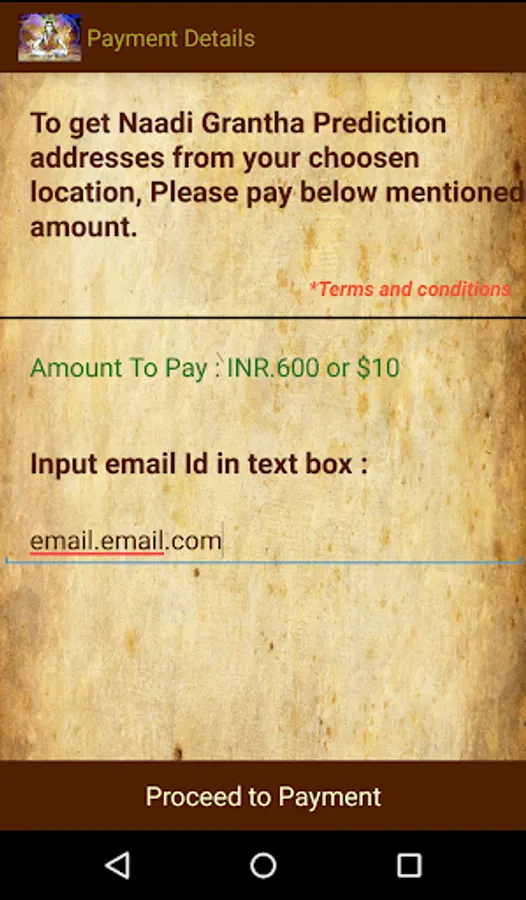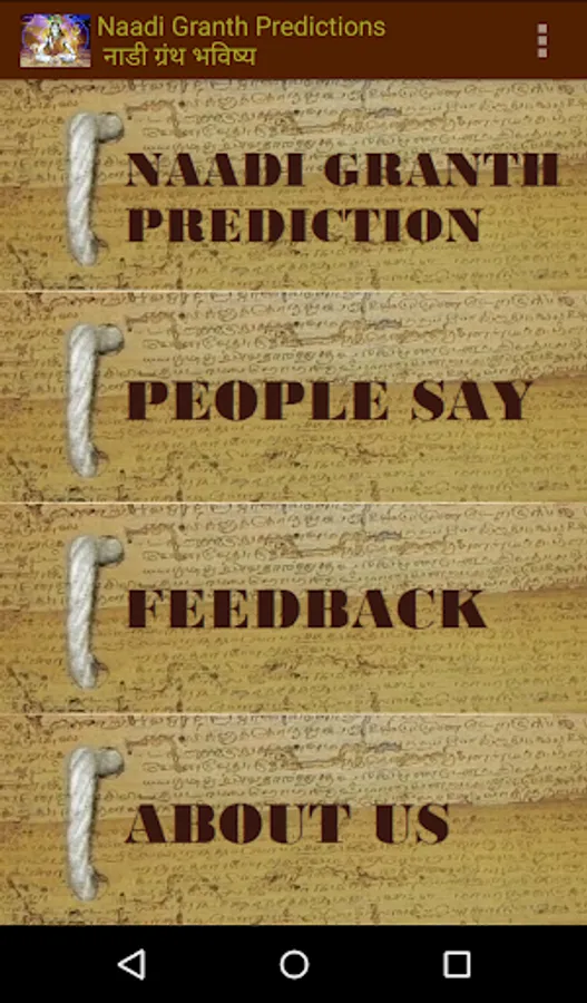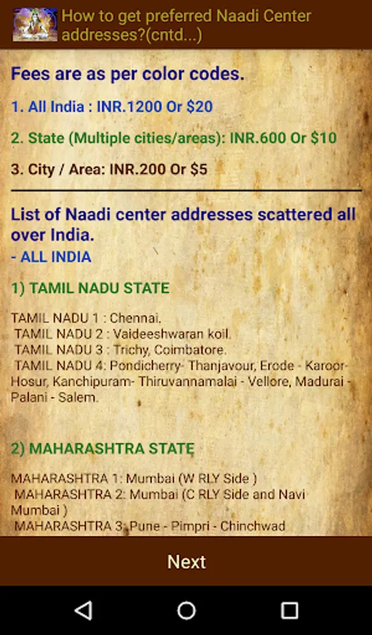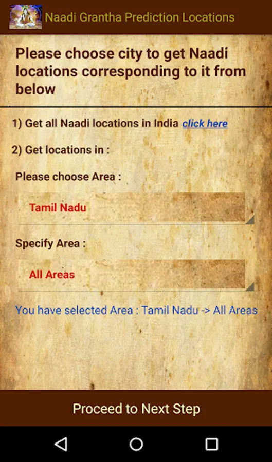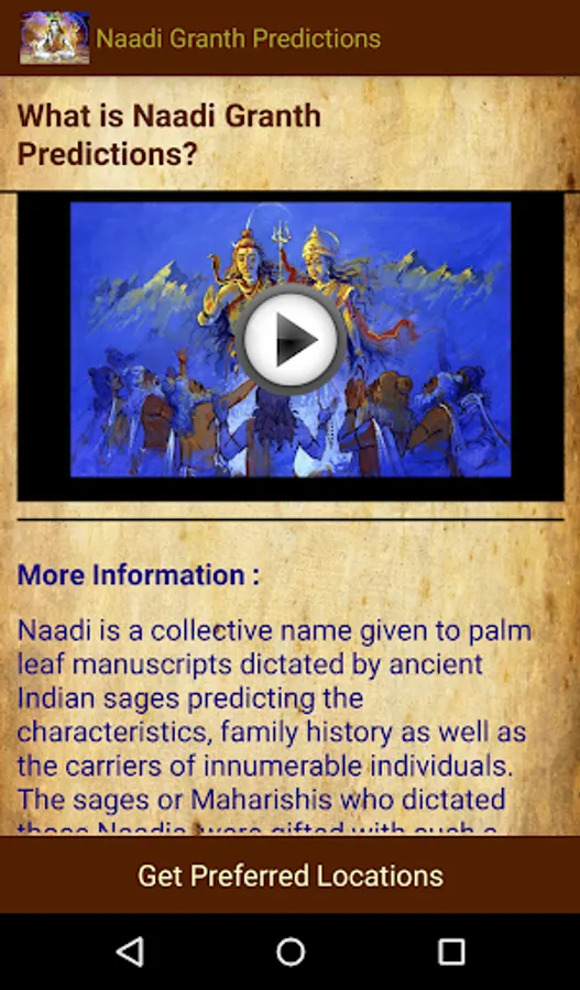 This app is aimed to create awareness about Ancient Maharishi’s work on palm leaves in old Tamil language, called “Naadi Ole Palm Leaf Predictions “. This app provider views Naadi Maharishi’s work as service to humanity. It is no way connected with any of the Naadi centers providing the Naadi reading Facilities. Options provided for expressing Naadi Reading Experience/opinions in ‘Feedback’ section are expected to be as a matter of fact and devoid of exaggeration.The opinions expressed by the visitors not to be taken as criticism but as guidance for further improvement by the concerned persons/centers. This app neither challenges nor accepts any challenge from any rationalist organisations or Individuals. Fees collected from Addresses provided will be utilised for conducting Workshops, Conferences on Naadi Related Indological academic topics from time to time and to make App sustainable and long lasting.