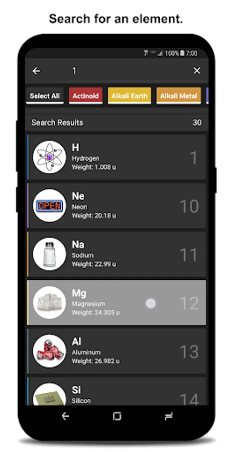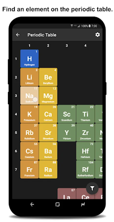 Use the periodic table filter button to hide/show the desired information on the periodic table. This feature allowing you to study the periodic table elements by location and clicking a tile to return to the specific card.