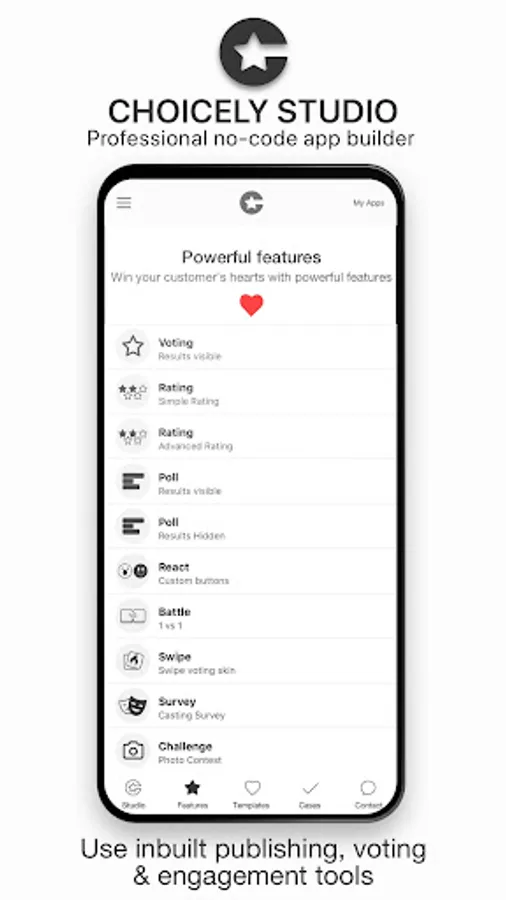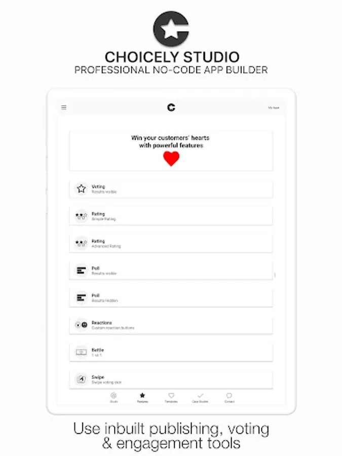 Discover Choicely Studio that gives you the freedom to create, design, manage and develop your app presence exactly the way you want. Choicely apps come with enterprise-grade publishing, voting & engagement tools and scalability to millions of simultaneous users.