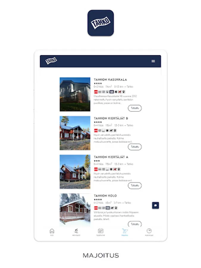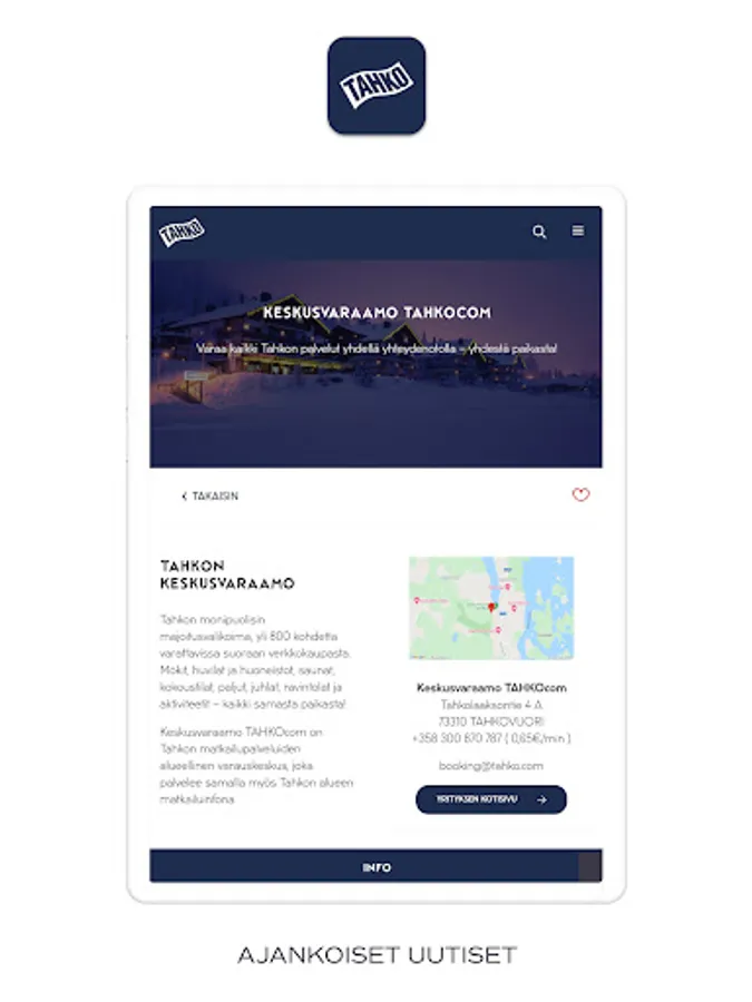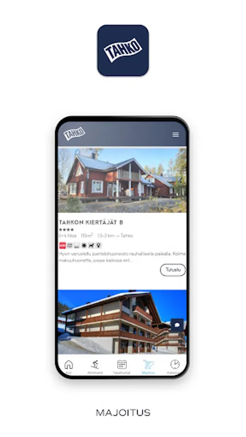 Join real faculty by downloading the Tahko app to your phone! Be the first to hear Tahko's news! If you wish, you can receive push messages about offers and events from companies in the area during your stay. In the Tahko application, you can also edit your accommodation booking and purchase additional services. With the app, you keep Tahko in your pocket at all times. With one click from Tahko, you can see events in the area, opening hours of companies and much more!