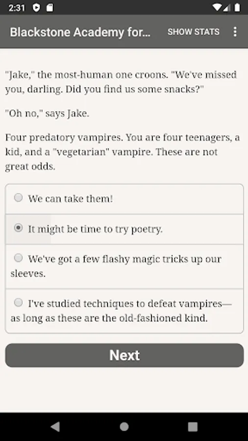 Blackstone Academy for the Magical Arts is a fast-paced 188,000-word interactive YA fantasy novel by Alana Joli Abbott, where your choices control the story. It's entirely text-based, without graphics or sound effects, and fueled by the vast, unstoppable power of your imagination.