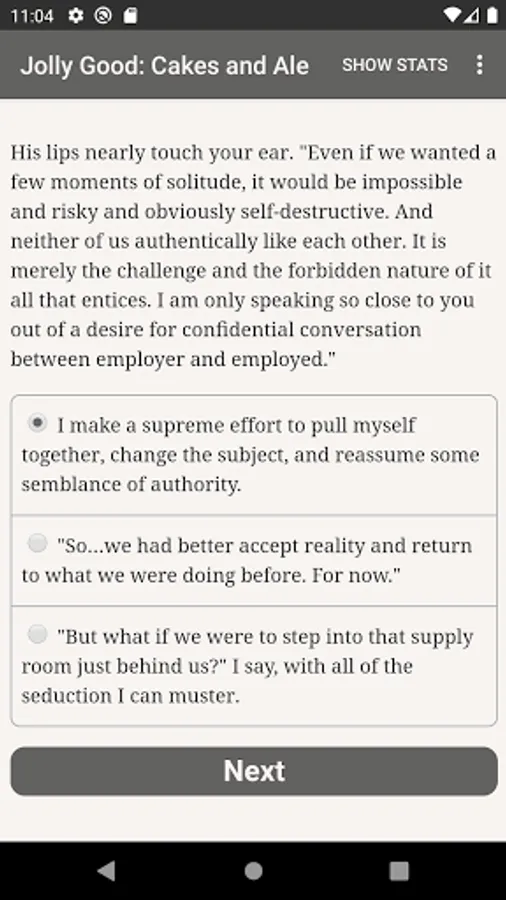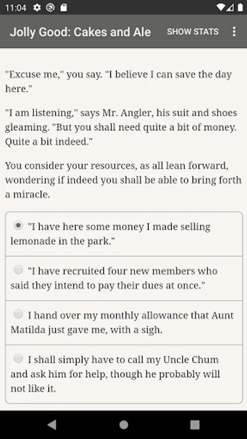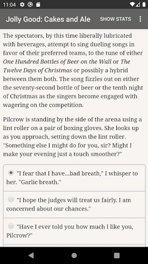 "Jolly Good: Cakes and Ale" is a 1.2 million—million!—word interactive comedy of manners by Kreg Segall. It's a standalone sequel to "Tally Ho" inspired by P.G. Wodehouse, where your choices control the story. It's entirely text-based—without graphics or sound effects—and fueled by the vast, unstoppable power of your imagination.