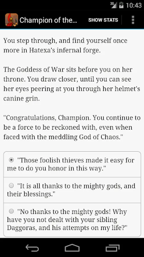 "Champion of the Gods" is a thrilling 217,000-word interactive novel by Jonathan Valuckas, where your choices control the story. It's entirely text-based--without graphics or sound effects--and fueled by the vast, unstoppable power of your imagination.