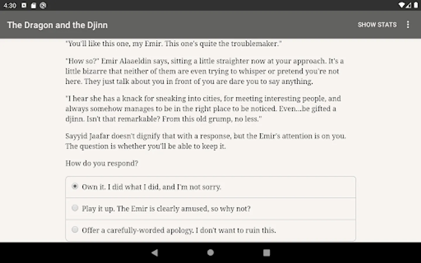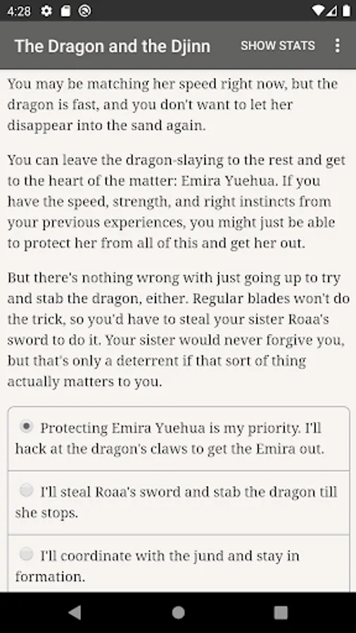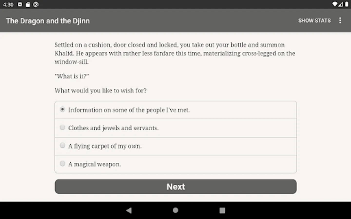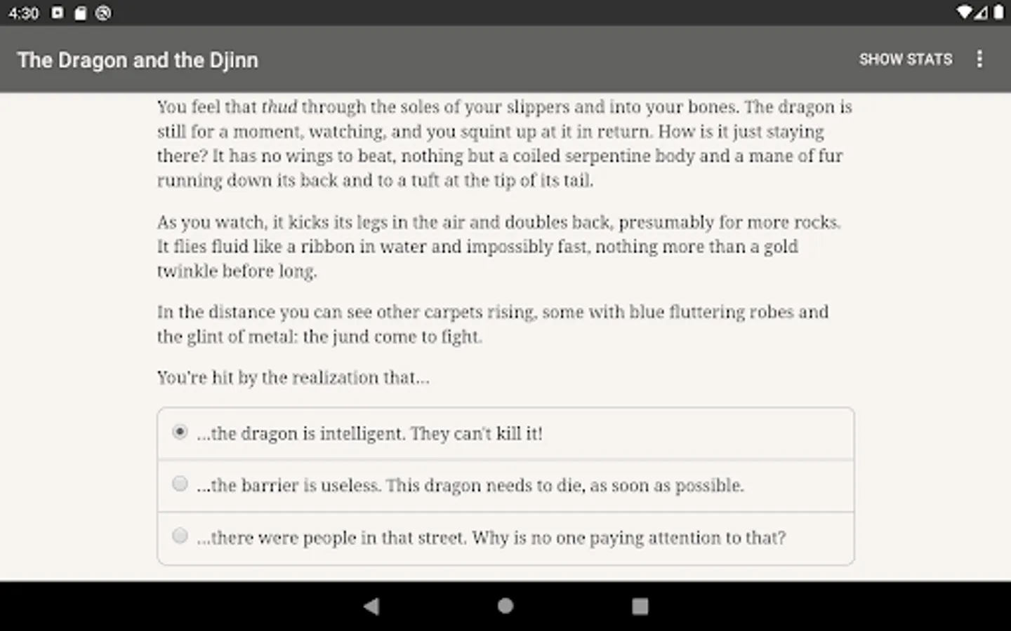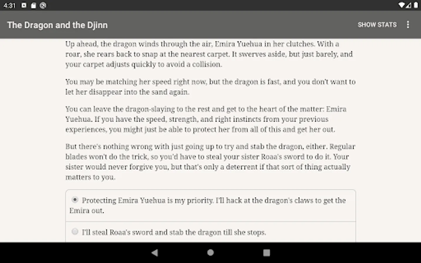 "The Dragon and the Djinn" is a 710,000 word interactive Arab epic fantasy novel by Athar Fikry, where your choices control the story. It's entirely text-based—without graphics or sound effects—and fueled by the vast, unstoppable power of your imagination.