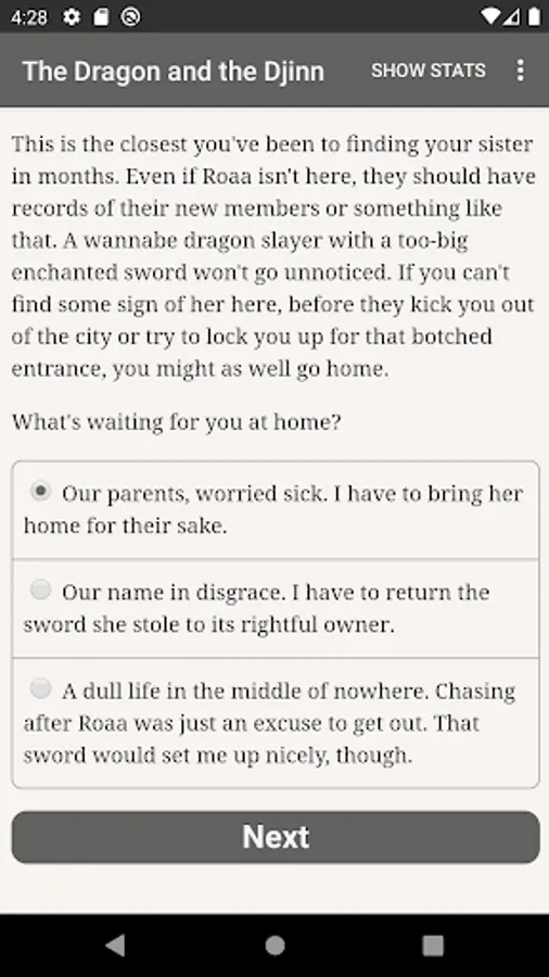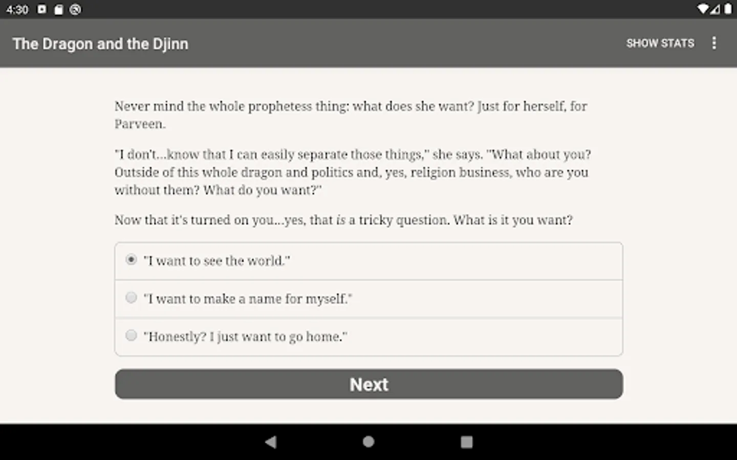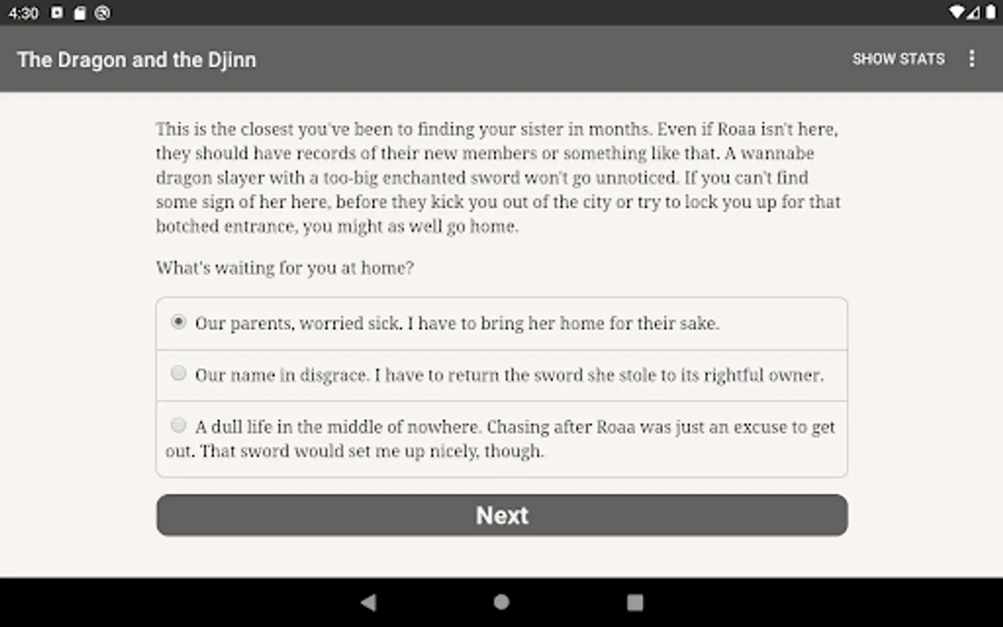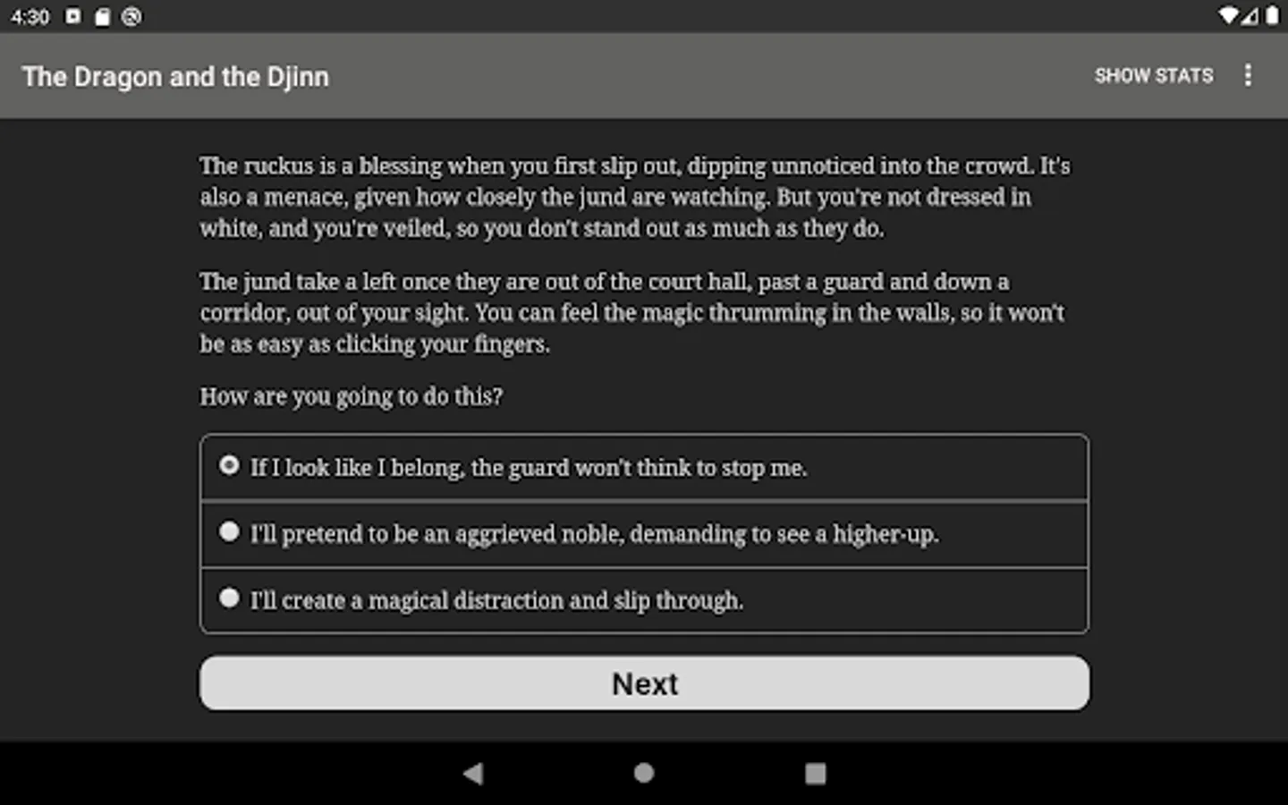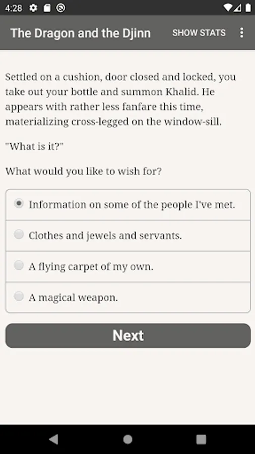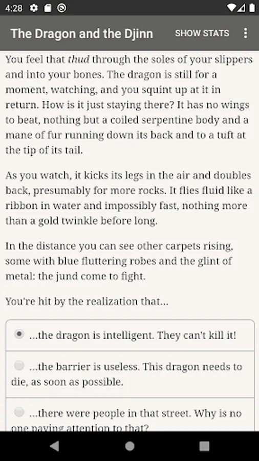 "The Dragon and the Djinn" is a 710,000 word interactive Arab epic fantasy novel by Athar Fikry, where your choices control the story. It's entirely text-based—without graphics or sound effects—and fueled by the vast, unstoppable power of your imagination.