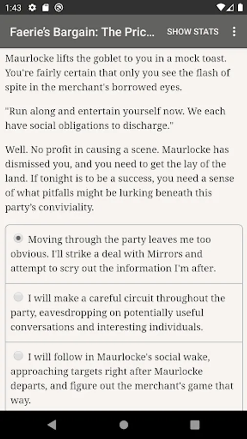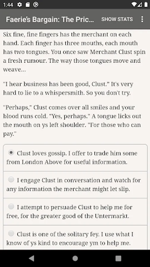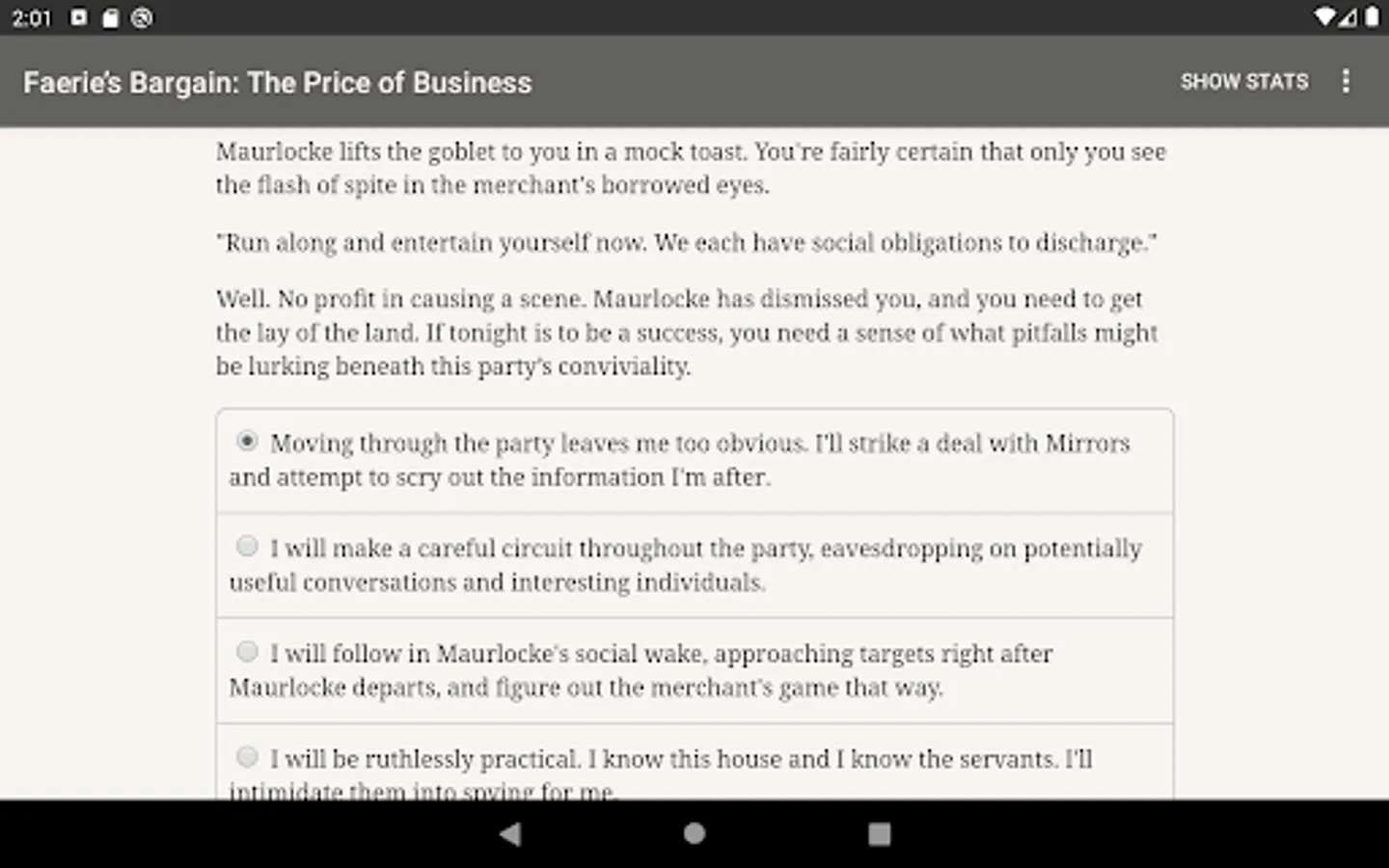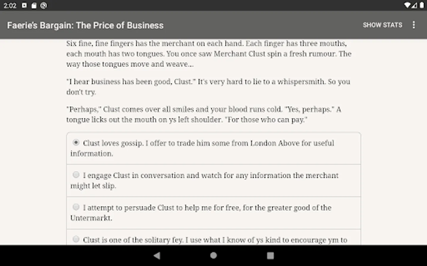 "Faerie's Bargain: The Price of Business" is a 300,000-word interactive fantasy novel by Trip Galey where your choices control the story. It's entirely text-based—without graphics or sound effects—and fueled by the vast, unstoppable power of your imagination.