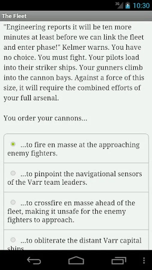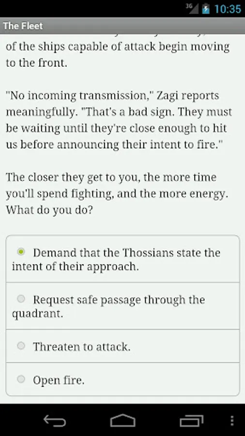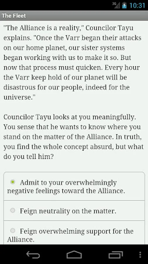 "The Fleet" is an interactive novel where you control the main character. In each chapter, your choices determine how the story proceeds.