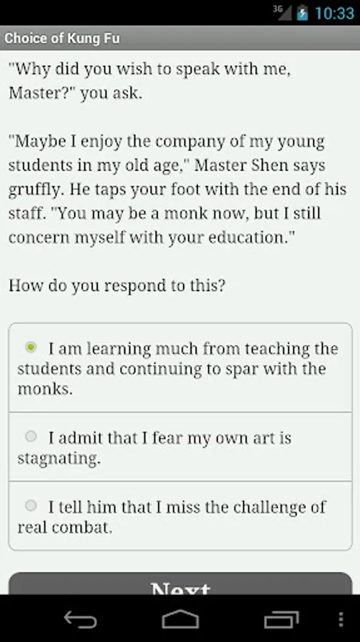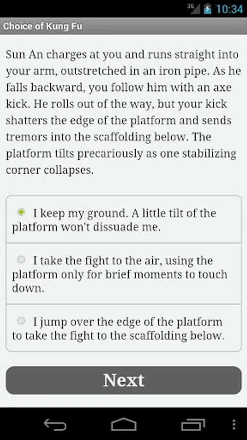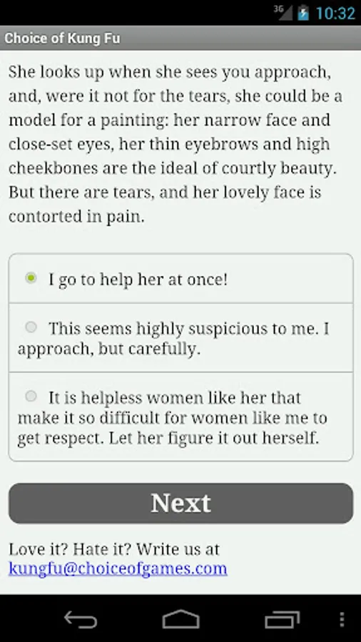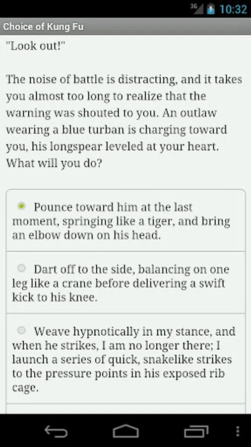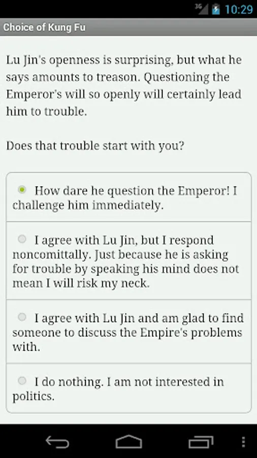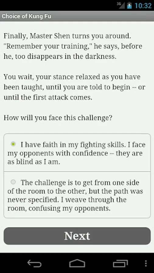 Choice of Kung Fu is a fast-paced interactive fantasy novel where your choices determine how the story proceeds. The game is entirely text-based--without graphics or sound effects--but powered by the vast, unstoppable power of your imagination.
