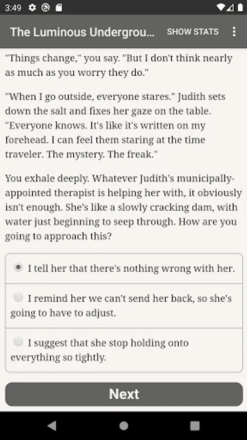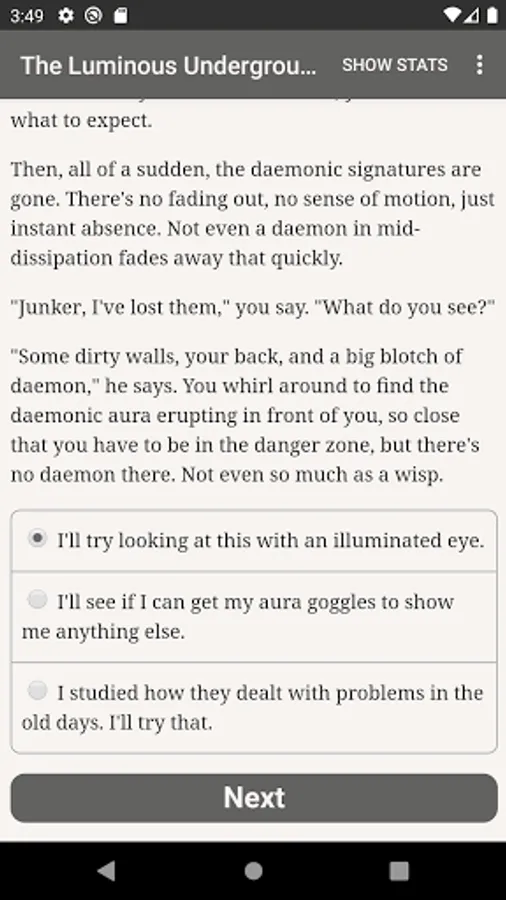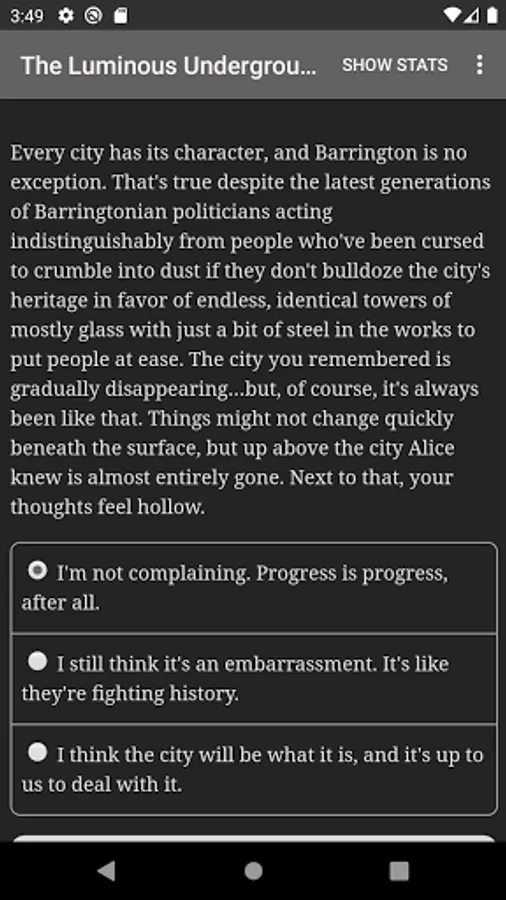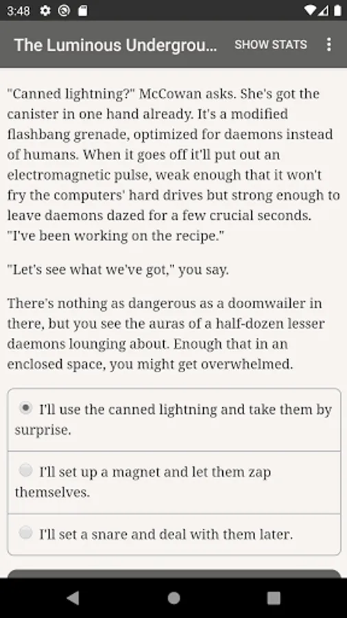 "The Luminous Underground" is a 660,000-word interactive secondary-world science fantasy novel by Phoebe Barton, where your choices control the story. It's entirely text-based—without graphics or sound effects—and fueled by the vast, unstoppable power of your imagination.