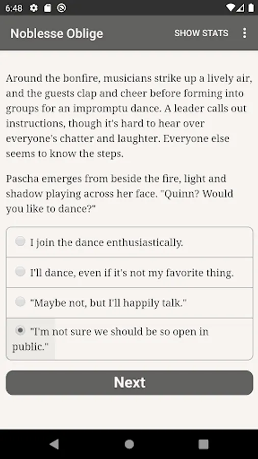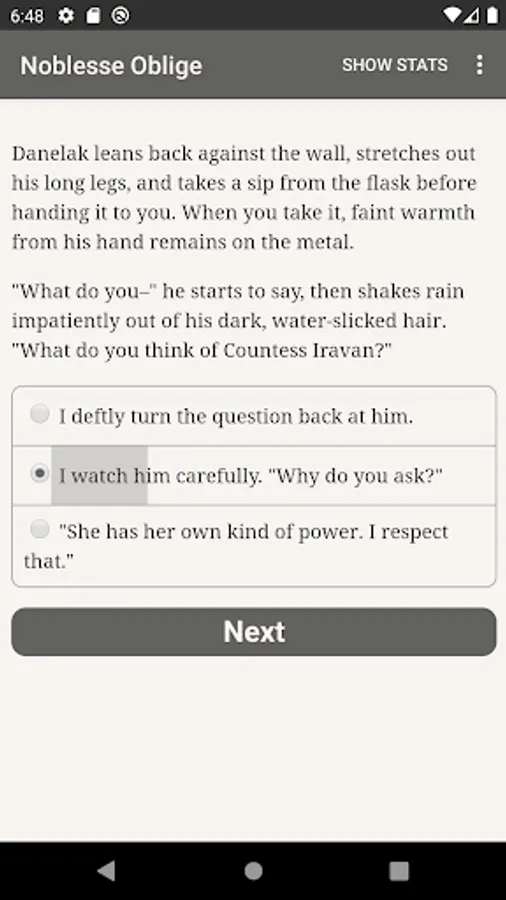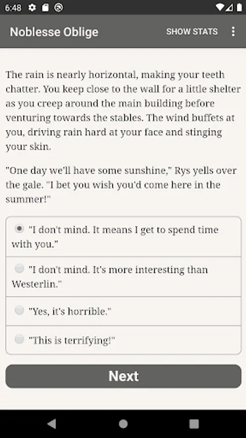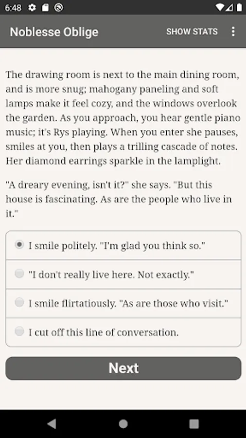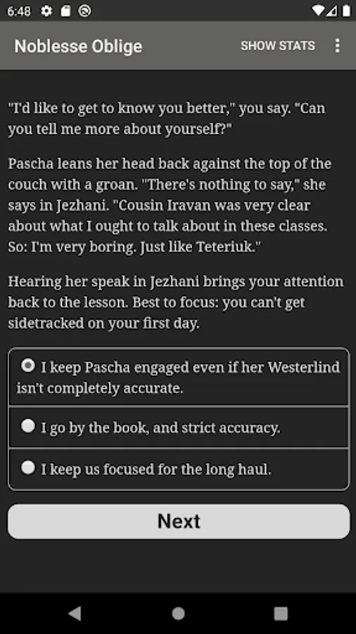 On a windswept island, far from the mild shores of Westerlin, stands the estate that is your new home. You have been hired to work as a conversation partner for a lonely aristocrat. It is a profitable opportunity, and your impoverished upbringing and middling university education leave you few others.