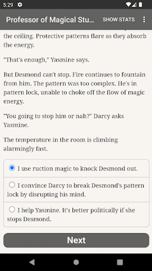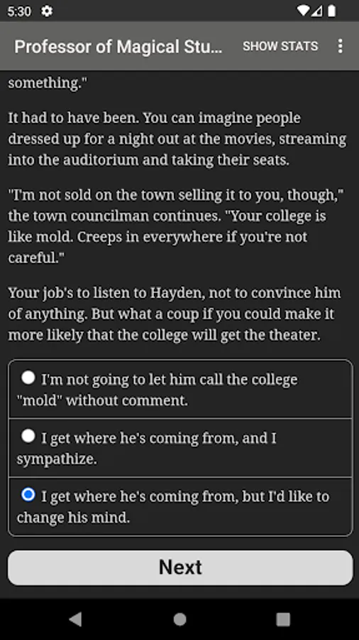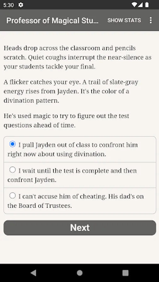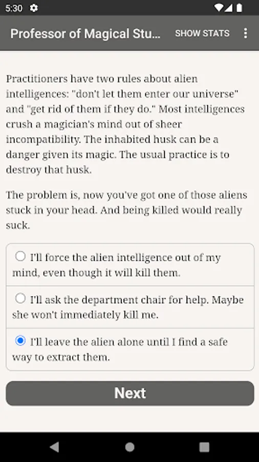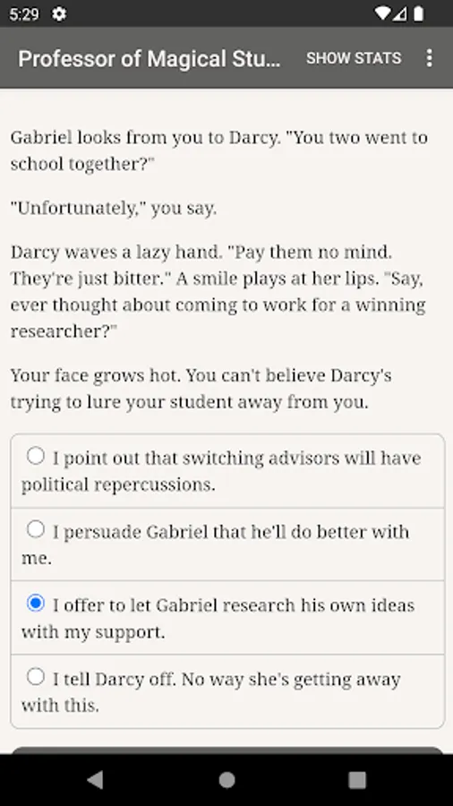 "Professor of Magical Studies" is a 500,000-word interactive fantasy novel by Stephen Granade. Your choices control the story. It's entirely text-based, without graphics or sound effects, and fueled by the vast, unstoppable power of your imagination.