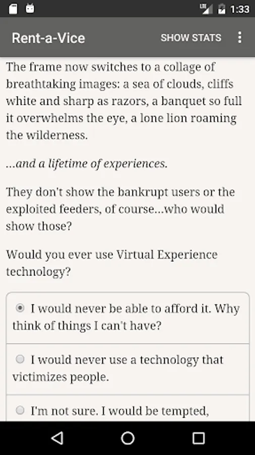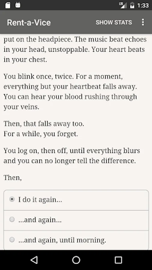 "Rent-a-Vice" is a 150,000-word interactive cyberpunk-noir mystery novel, and 2018 Nebula Award for Game Writing Finalist, by Natalia Theodoridou, where your choices control the story. It's entirely text-based—without graphics or sound effects—and fueled by the vast, unstoppable power of your imagination.