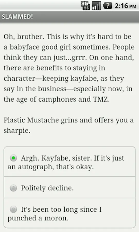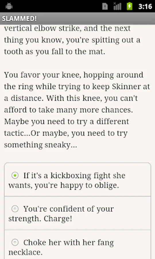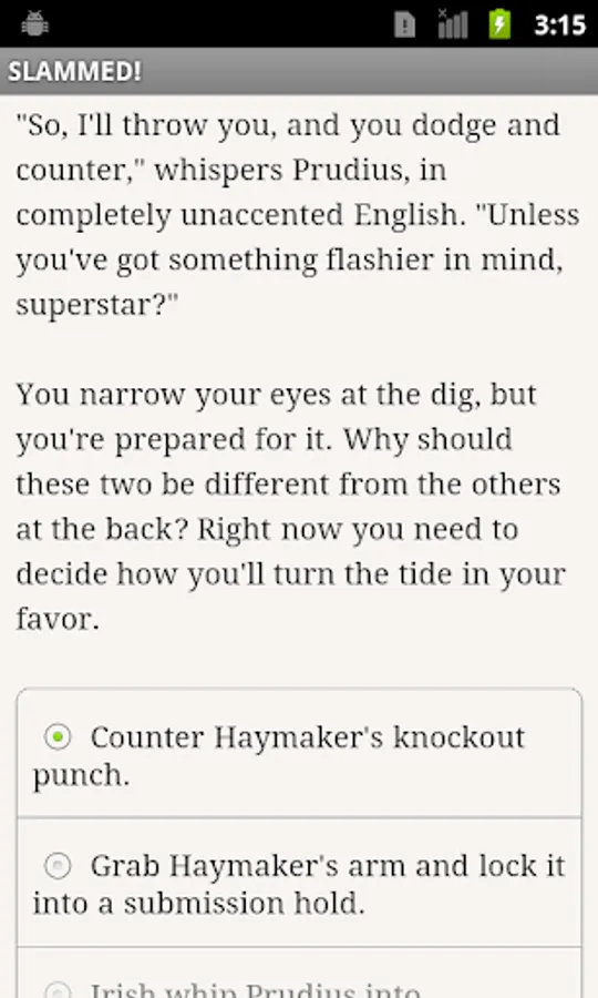 Slammed! is an epic interactive professional-wrestling novel by Paolo Chikiamco, where your choices determine how the story proceeds. The game is entirely text-based--without graphics or sound effects--but driven by the vast, unstoppable power of your imagination.