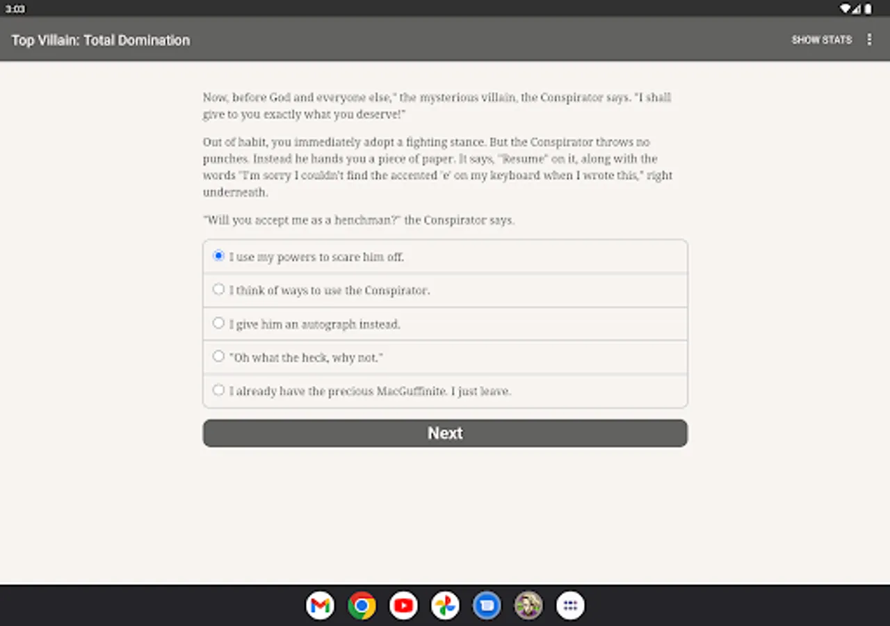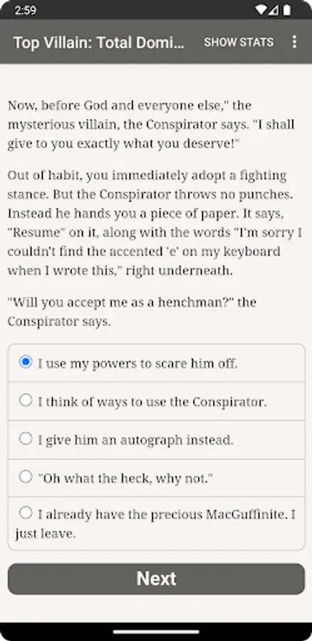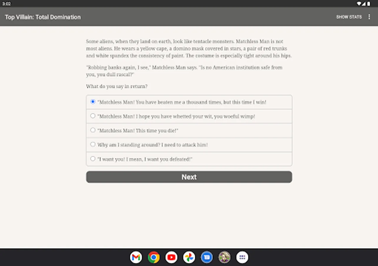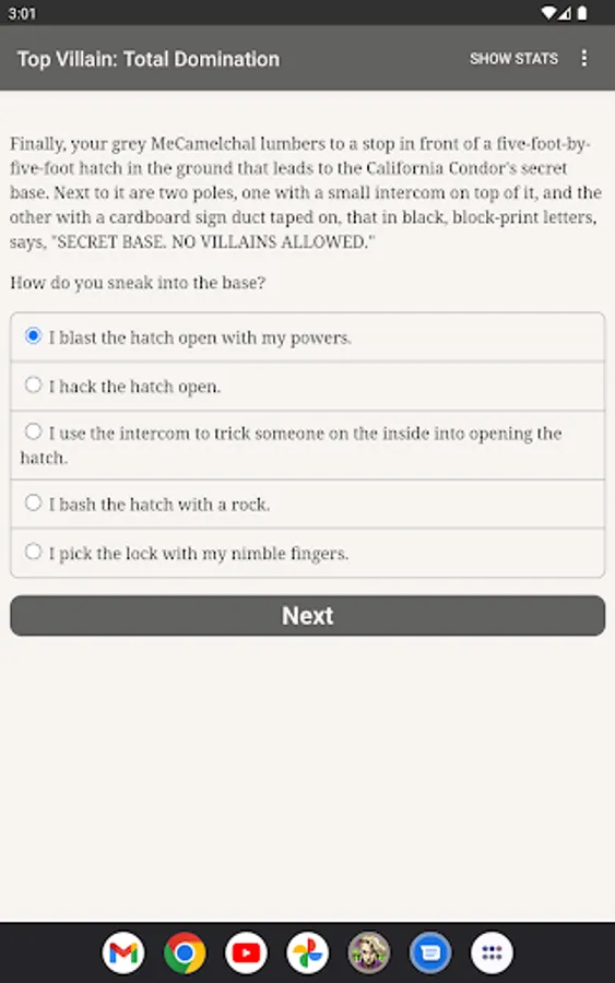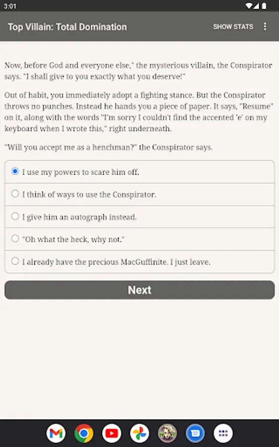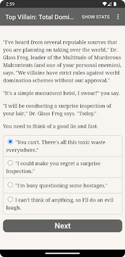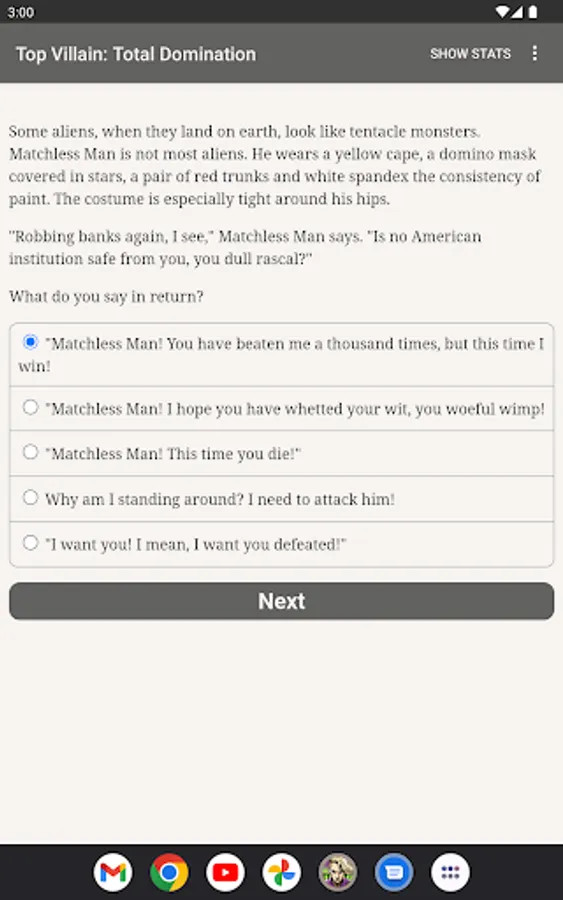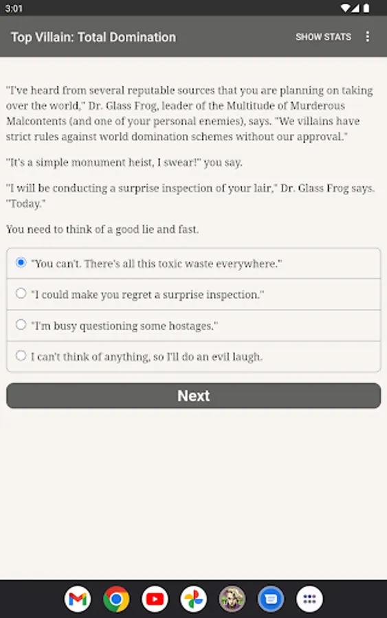 Top Villain: Total Domination is a 228,000-word interactive comedy supervillain novel by Brandon Greer. It’s entirely text-based, without graphics or sound effects, and fueled by the vast, unstoppable power of your imagination.