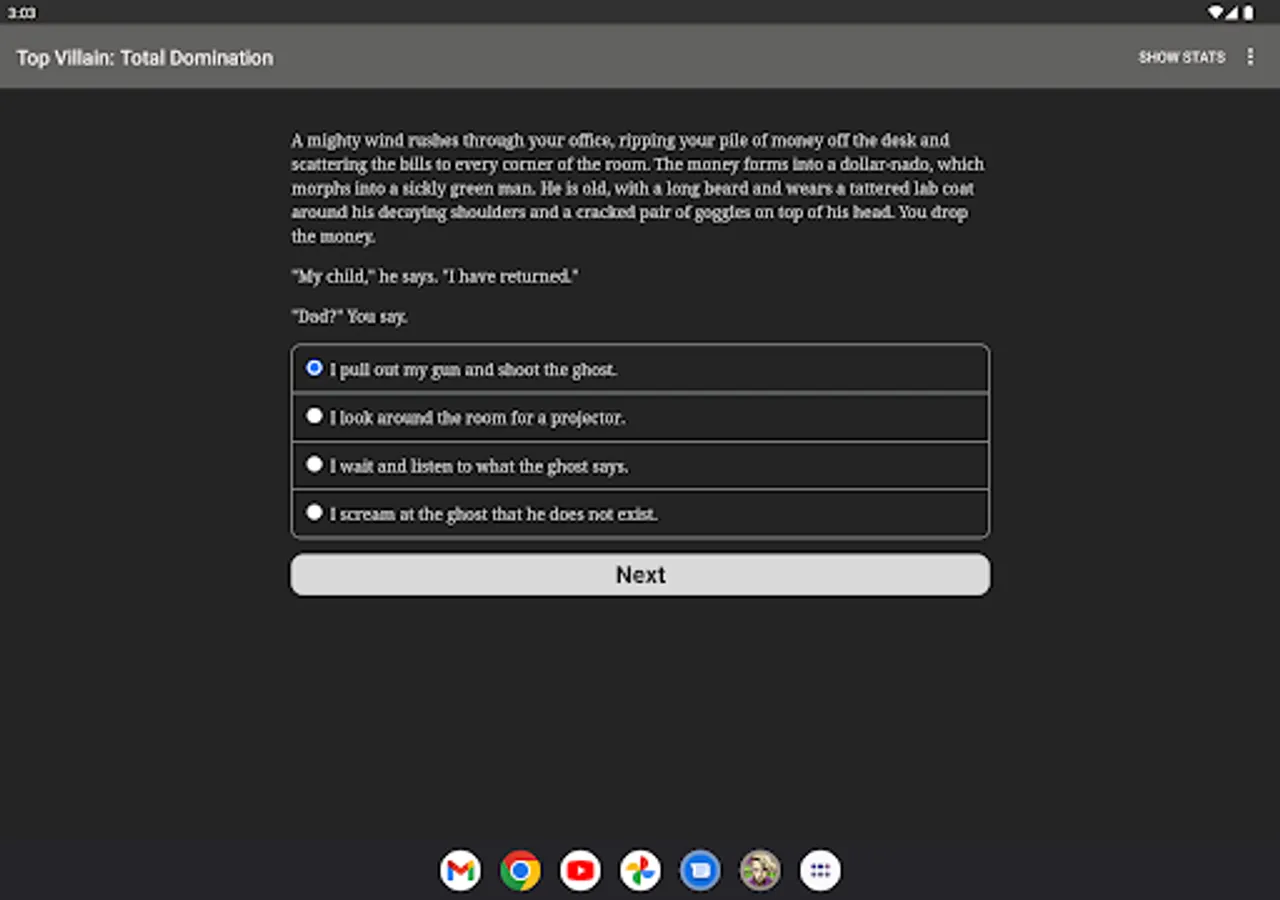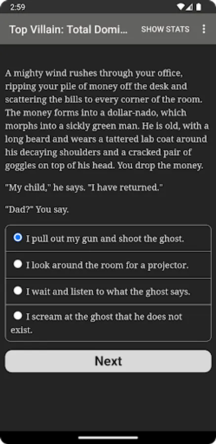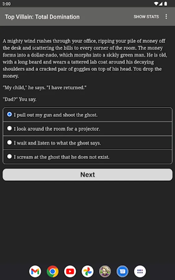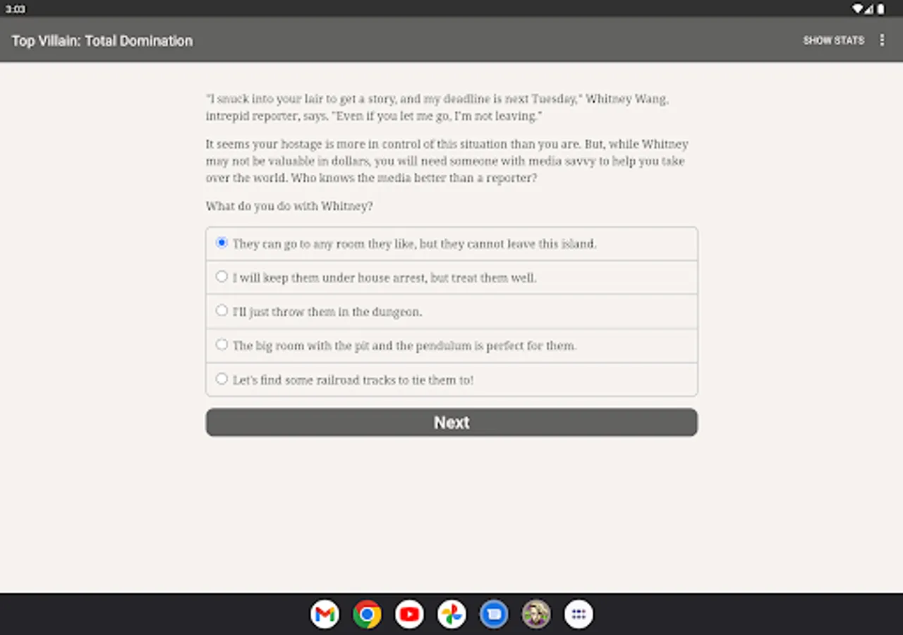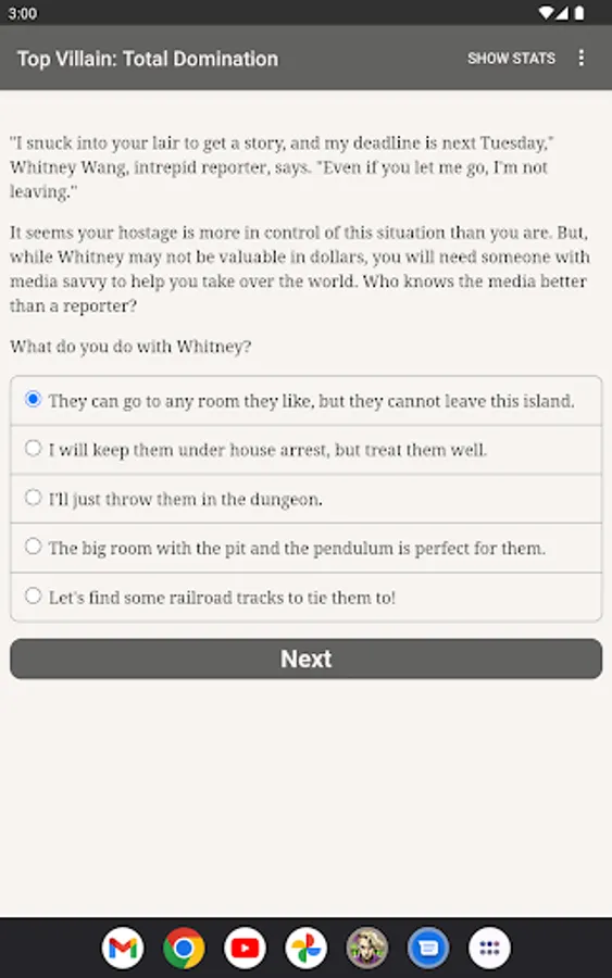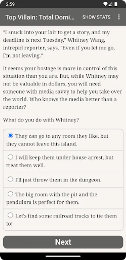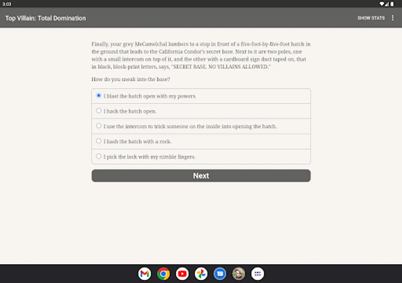 Top Villain: Total Domination is a 228,000-word interactive comedy supervillain novel by Brandon Greer. It’s entirely text-based, without graphics or sound effects, and fueled by the vast, unstoppable power of your imagination.
