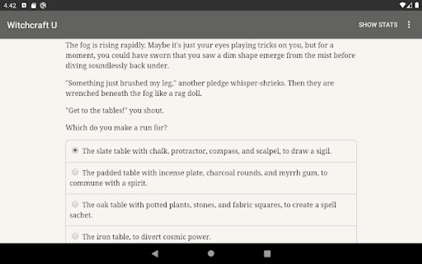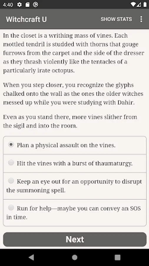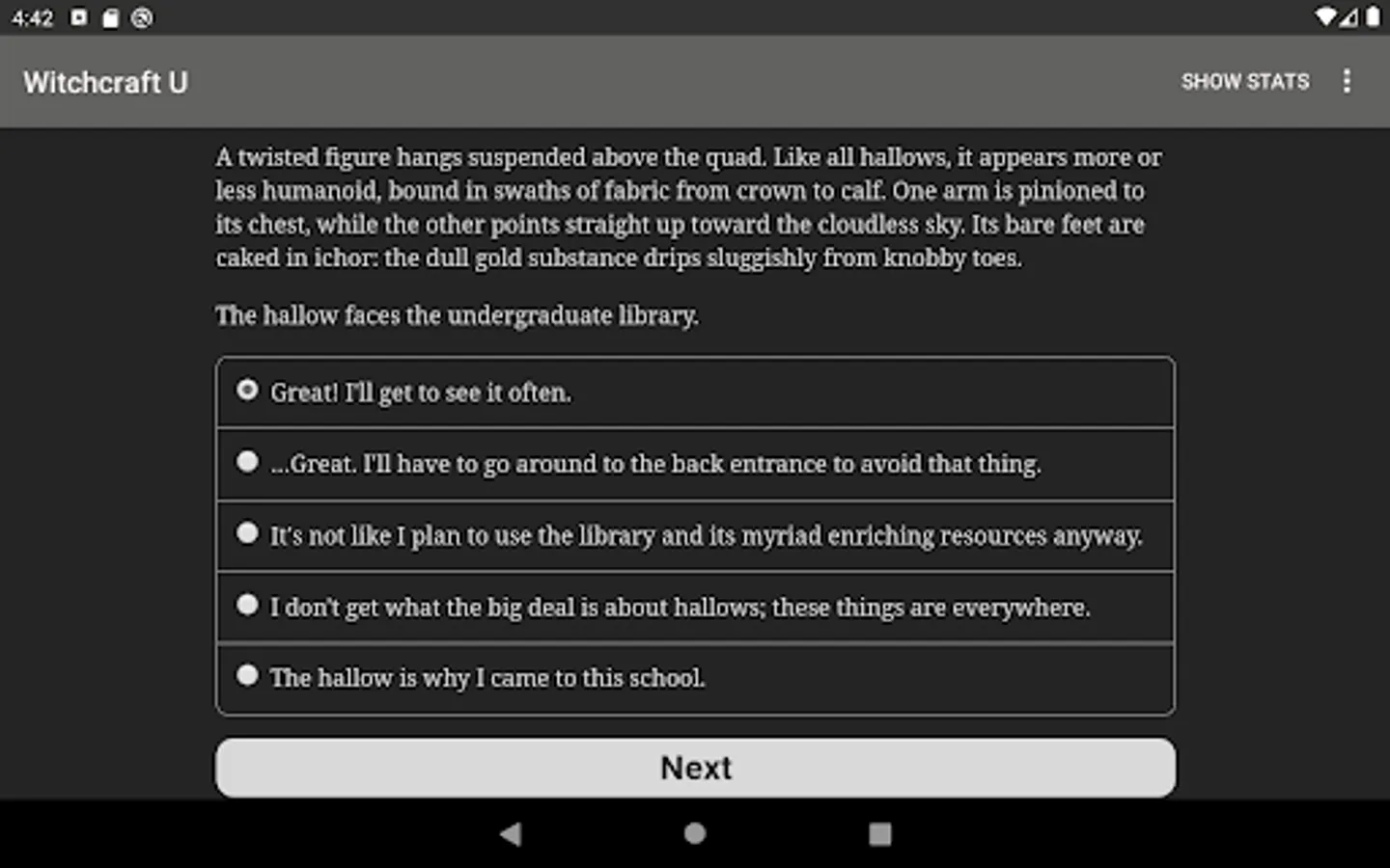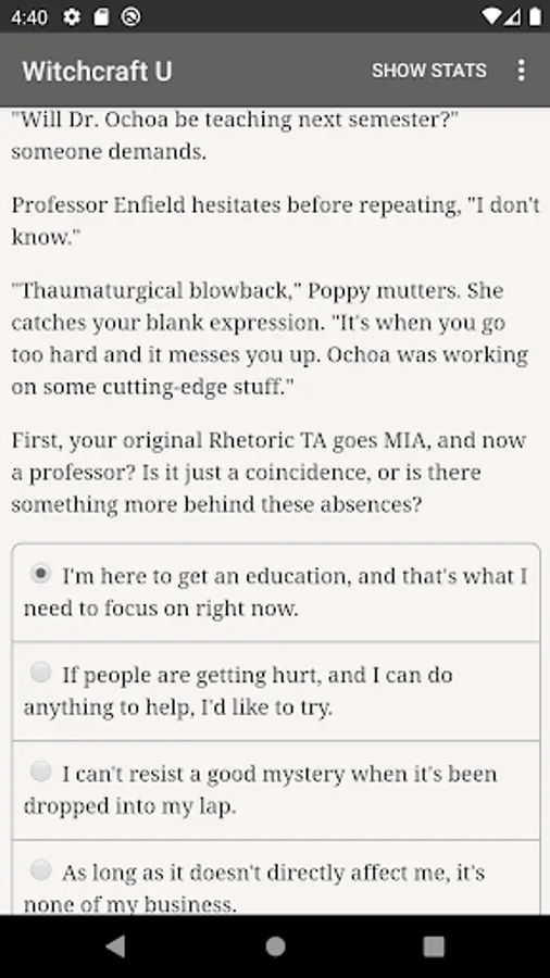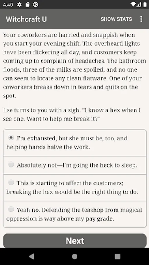 "Witchcraft U" is a 200,000-word interactive fantasy novel by Jei D. Marcade. It's entirely text-based, without graphics or sound effects, and fueled by the vast, unstoppable power of your imagination.