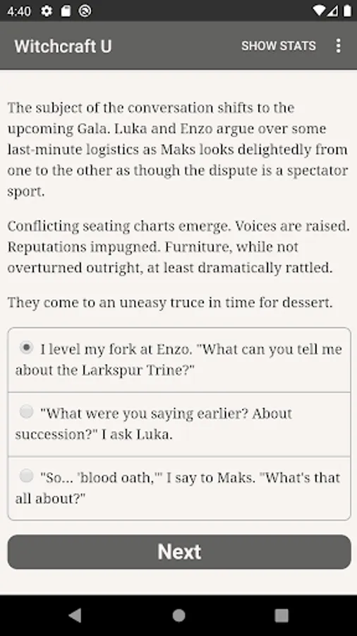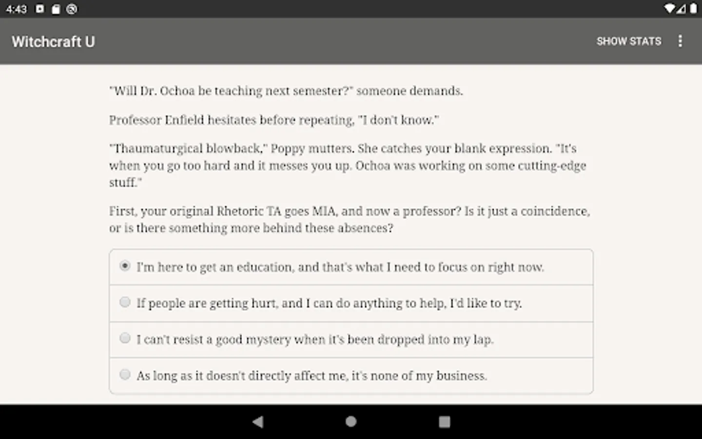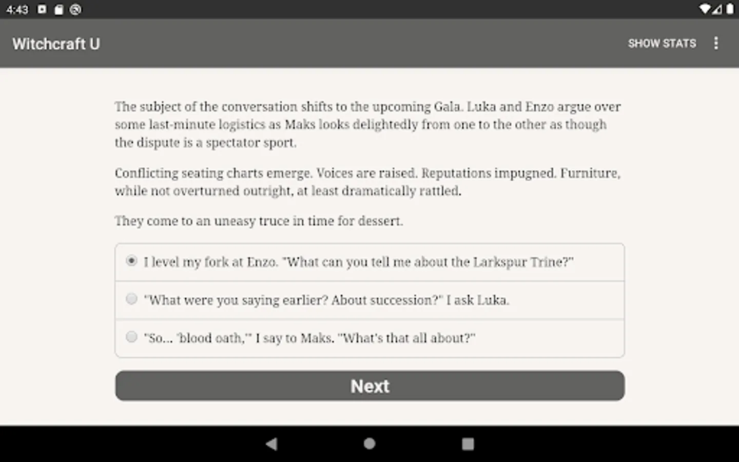 "Witchcraft U" is a 200,000-word interactive fantasy novel by Jei D. Marcade. It's entirely text-based, without graphics or sound effects, and fueled by the vast, unstoppable power of your imagination.