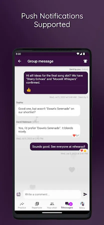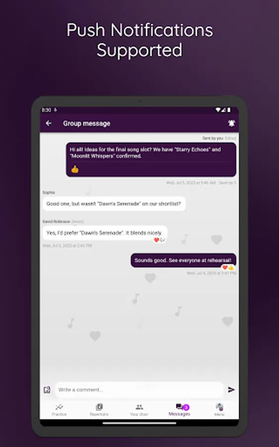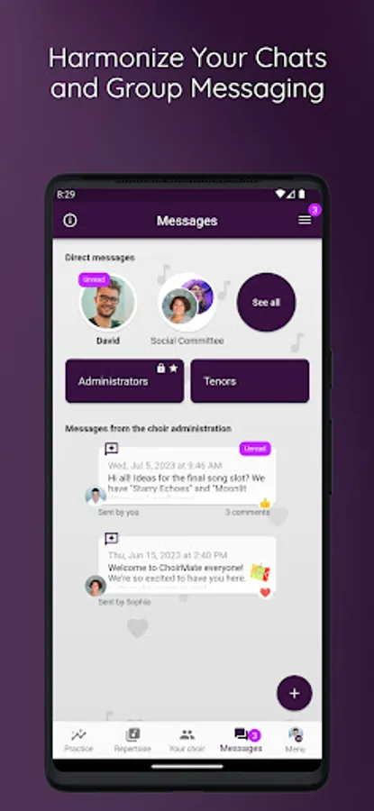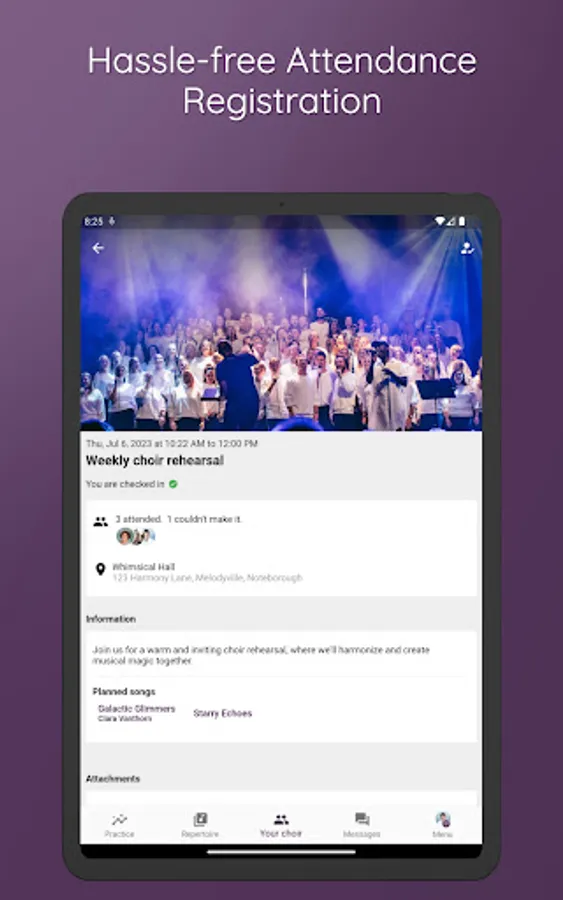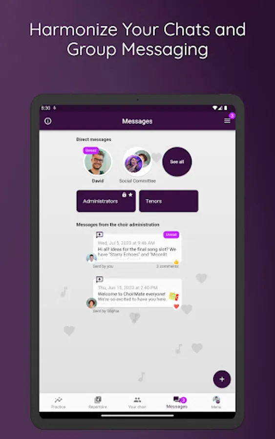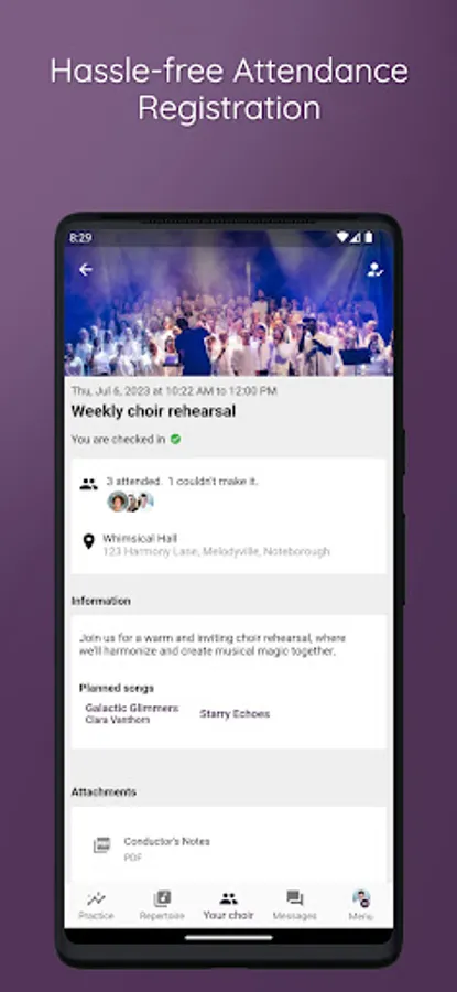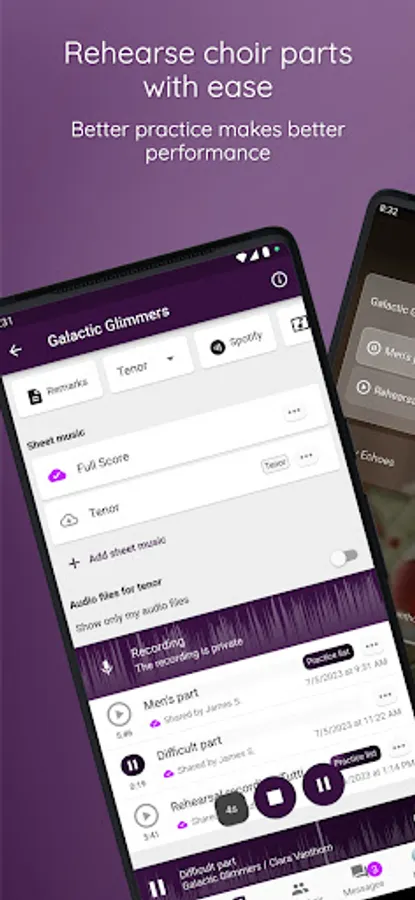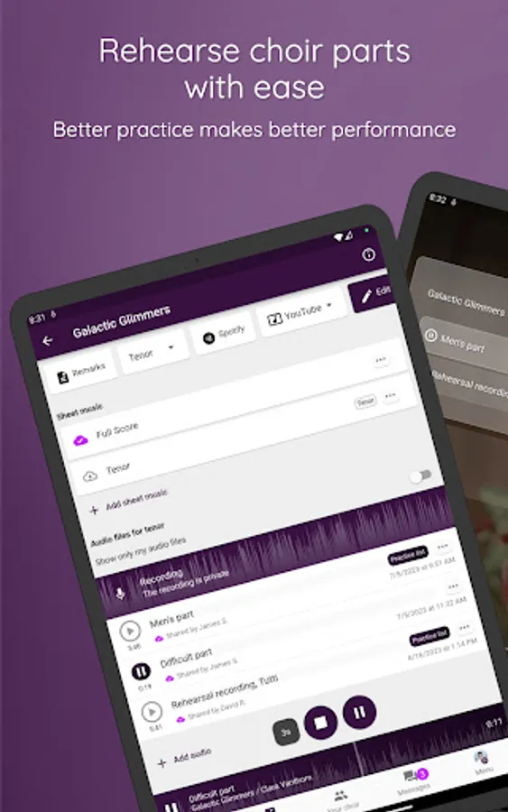 ChoirMate helps with set lists, audio files, sheet music, communication, activity calendar and, last but not least, self-practice. Use it as a conductor, board member or choir member.