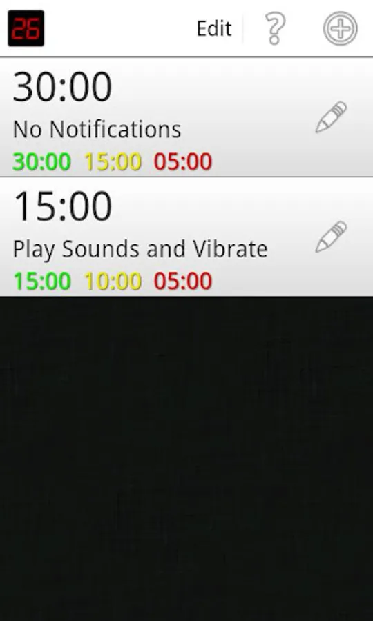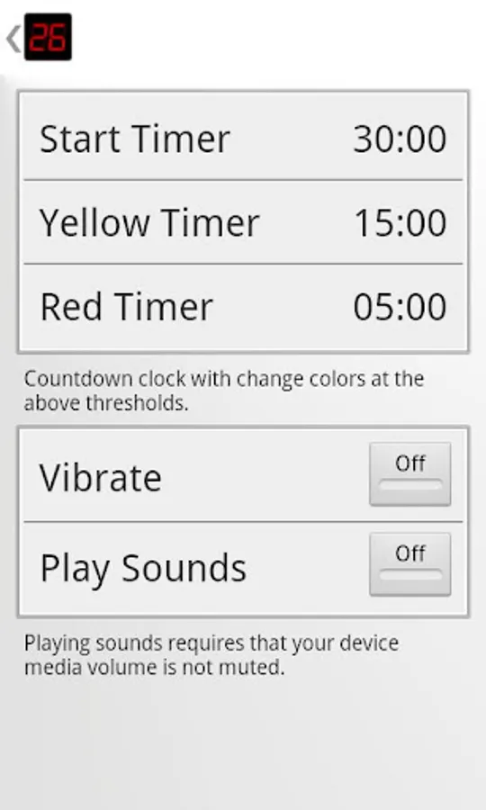 * Timers can be configured to give audible and/or vibration alerts when crossing a time limit threshold -- but if you want a completely silent countdown, thats ok too.