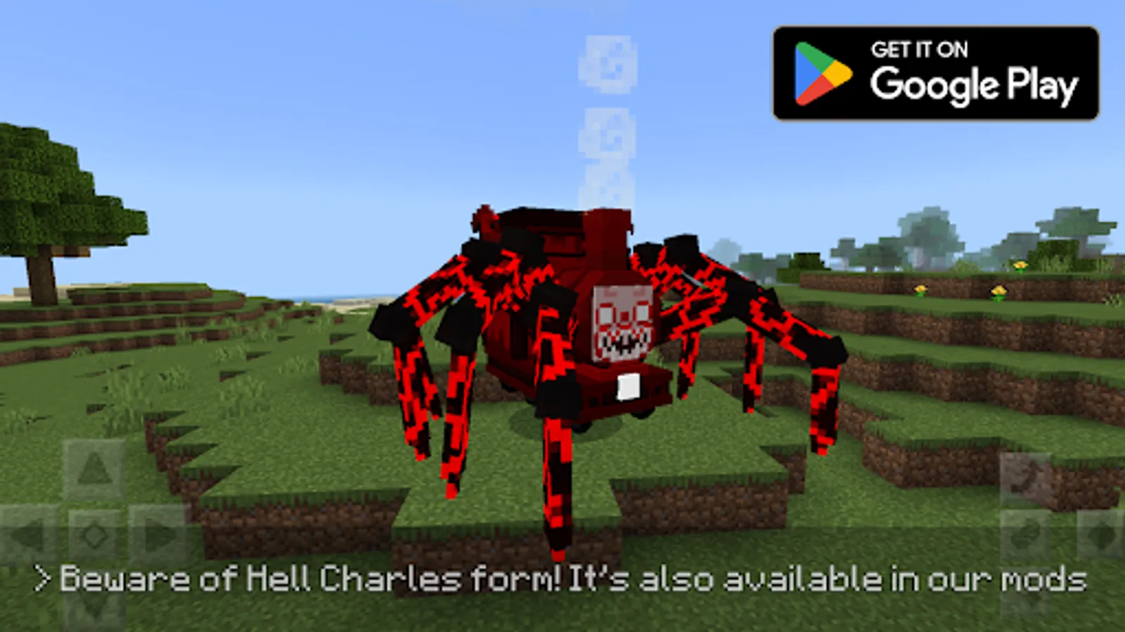 This app, Choo Choo Charles Mod for Minecraft PE will allow you to install horror mods for MCPE and survival maps, including the one of the same name, where you will meet a monster in the form of a scary spider train named Charles. He is very strong, fast, scary and quite hungry. No one knows where the creature came from, but one thing is for sure, Charles will prey on the poor human body he finds. You will need to be prepared before you fight the Choo Choo Charles in Minecraft.
