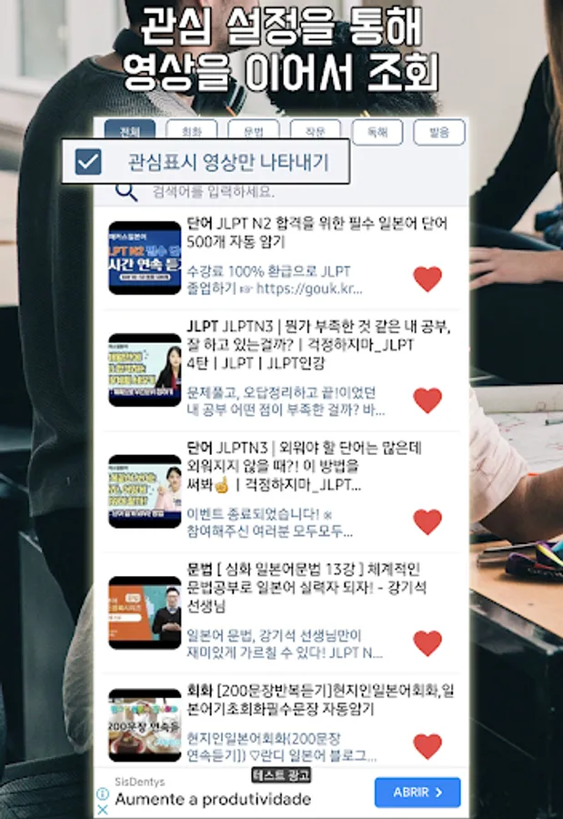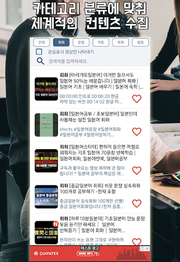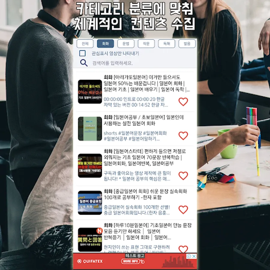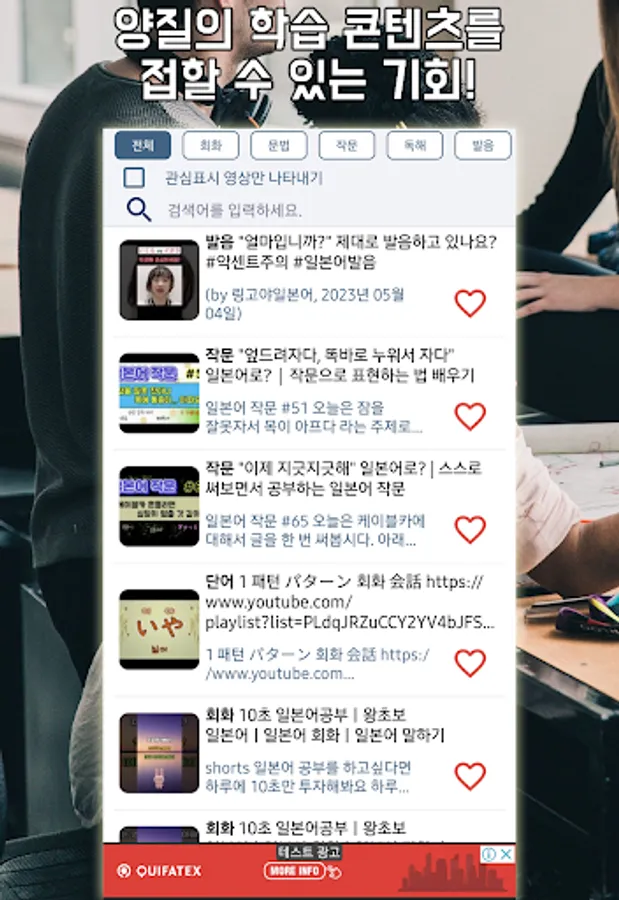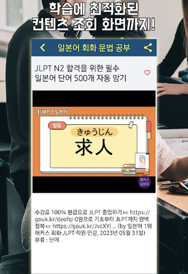 각 카테고리별("회화", "문법", "작문", "독해", "발음", "단어", "듣기", "JLPT")로 양질의 콘텐츠가 가득하니 지금 바로 확인해보세요.