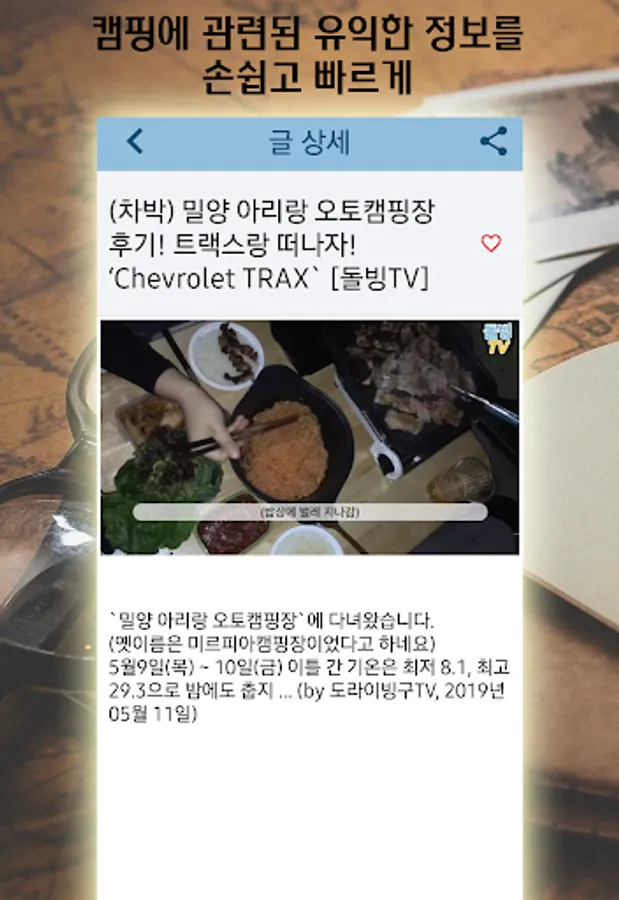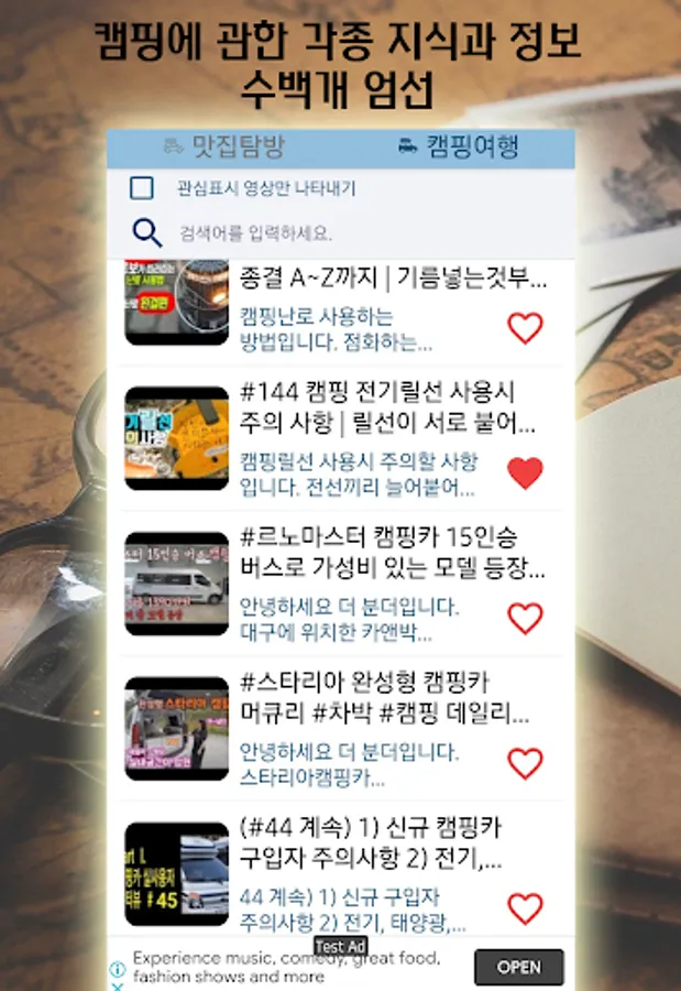 그리고 캠핑여행에 조심할 점, 필요한 장비, 캠핑명소에 관해서도 200여개의 영상을 준비했습니다.