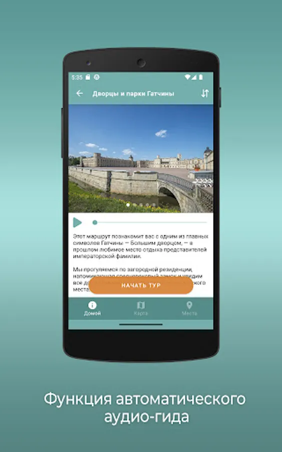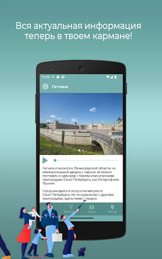 Туристический гид по городу Гатчина с маршрутами для пеших прогулок и звуковым информационным сопровождением. Все материалы в приложении уникальны – качественные фотографии, авторские тексты и маршруты. Теперь ваш экскурсовод по Гатчине всегда под рукой даже без доступа в интернет!