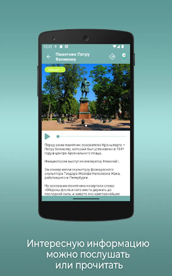 Download the map in advance to use the app offline, or just choose one of the suggested routes and go explore the city. The recording will start playing as soon as you get close to the point of interest. Stop recording at any time or listen again. Your walk will be informative and exciting! Now the city of Kronstadt will open its secrets for you.