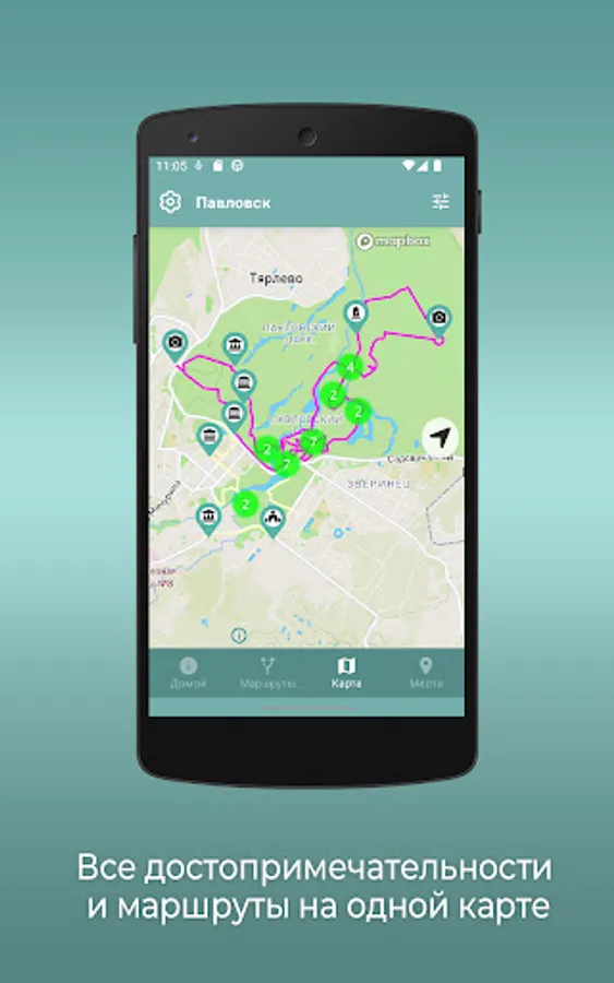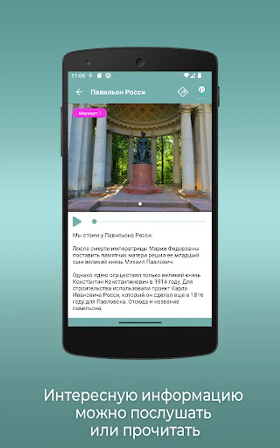 Tourist guide to Pavlovsk with hiking trails and audio information. All materials in the application are unique - high-quality photos, copyright texts and routes. Your guide to Pavlovsk is always at hand even without Internet access!