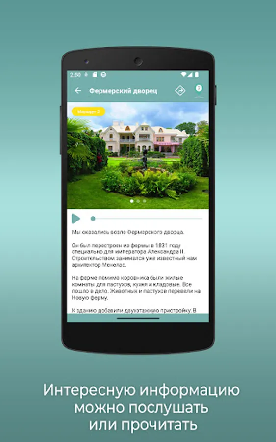 Download the map in advance to use the app offline, or just choose one of the suggested routes and go explore the city. The recording will start playing as soon as you get close to the point of interest. Stop recording at any time or listen again. Your walk will be informative and exciting! Now the city of Peterhof will open its secrets for you.