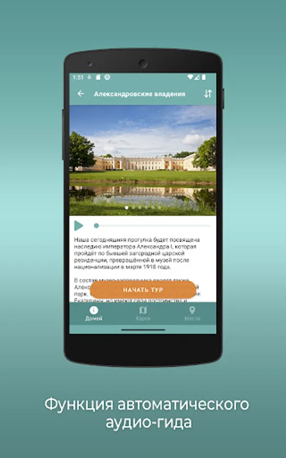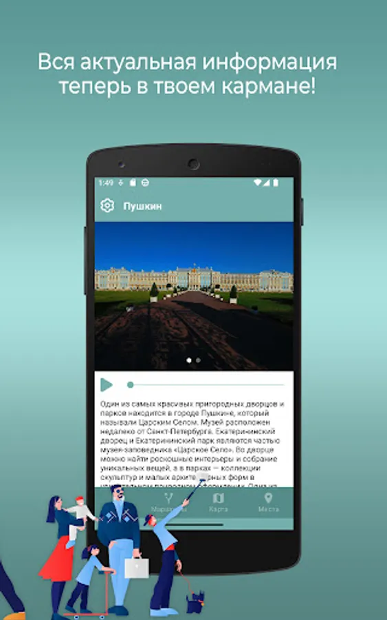 Туристический гид по городу Пушкин (Царскому селу) с маршрутами для пеших прогулок и звуковым информационным сопровождением. Все материалы в приложении уникальны – качественные фотографии, авторские тексты и маршруты. Теперь ваш экскурсовод по Пушкину всегда под рукой даже без доступа в интернет!