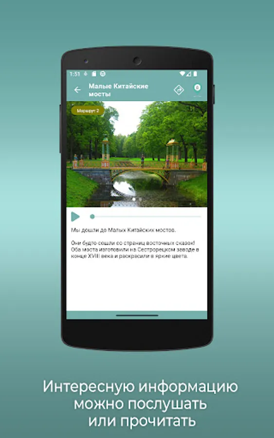 Скачайте карту заранее, чтобы использовать приложение оффлайн, или просто выберите один из предложенных маршрутов и отправляйтесь осматривать город. Воспроизведение записи начнется, как только вы приблизитесь к достопримечательности. Останавливайте запись в любое время или прослушивайте заново. Ваша прогулка станет познавательной и увлекательной! Теперь город Пушкин откроет для Вас свои секреты.