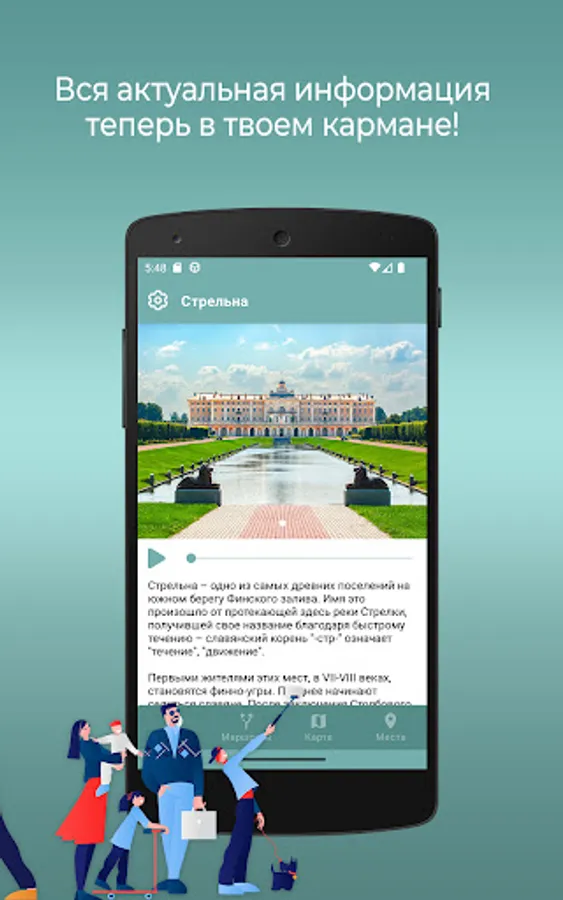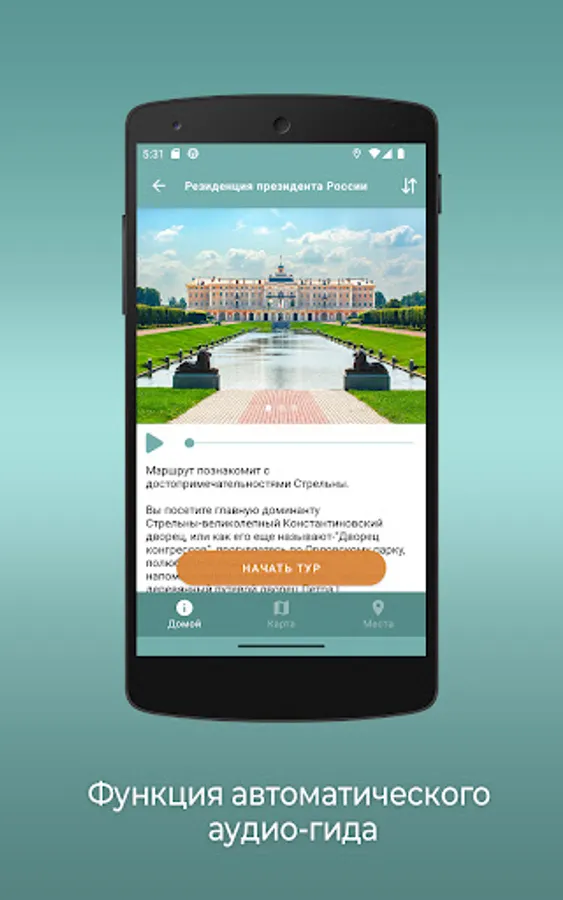 Tourist guide for the city of Strelna with hiking trails and audio information. All materials in the application are unique - high-quality photos, author's texts and routes. Now your guide to Strelna is always at hand even without Internet access!