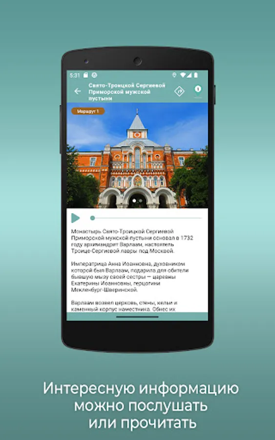 Download the map in advance to use the app offline, or just choose one of the suggested routes and go explore the city. The recording will start playing as soon as you get close to the point of interest. Stop recording at any time or listen again. Your walk will be informative and exciting! Now the city of Strelna will open its secrets for you.