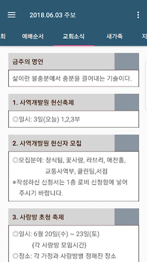 It is a smart newsletter that replaces paper jubo, which has been synonymous with waste of the church in the meantime. In the era of the Smart Age, the church can use smart devices to add convenience and efficiency to the church ministry and the church life of the Saints, and save resources and church finances. The global church is a smart church that takes the lead in this church innovation.