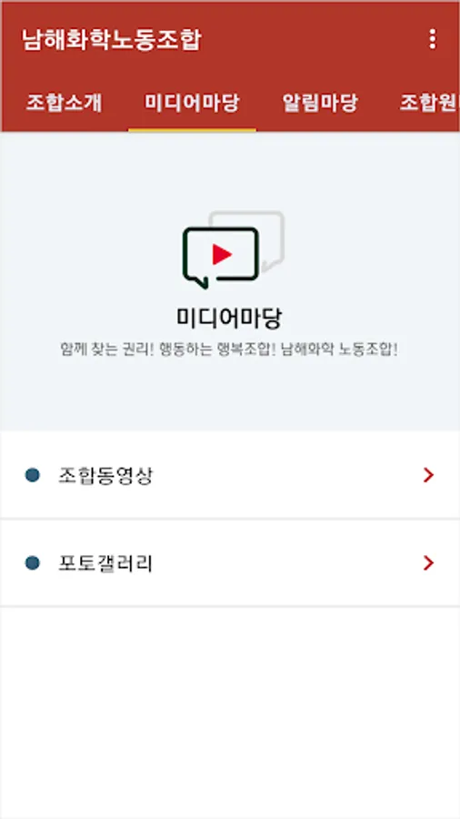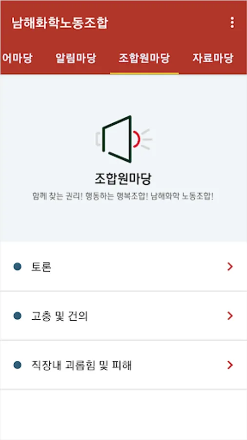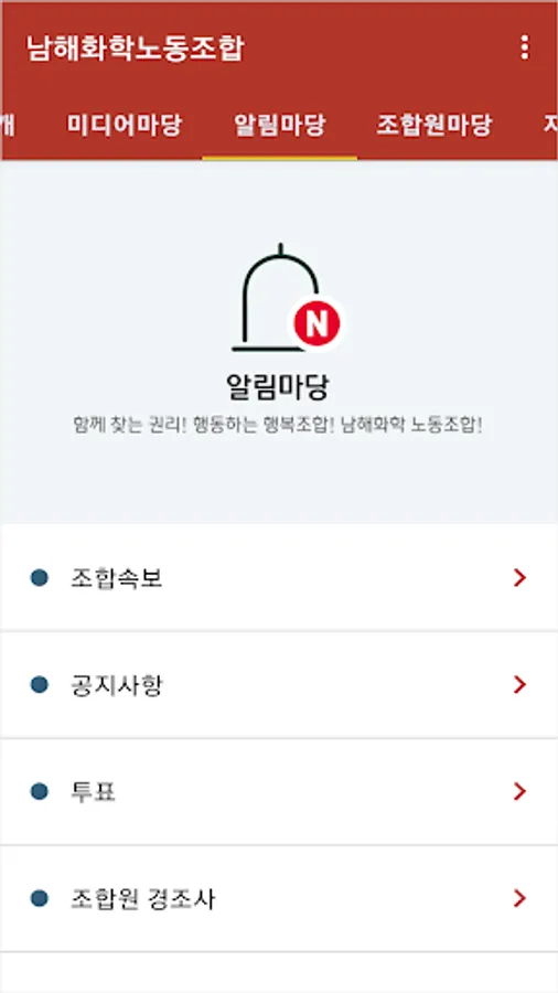 The app consists of menus such as union introduction, notification room, newspaper, survey and voting, and community, and is used as a space for union communication. Currently, it works only on smartphones of those who are members of the Namhae Chemical Labor Union.
