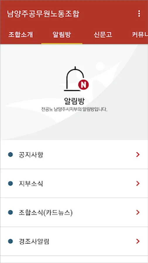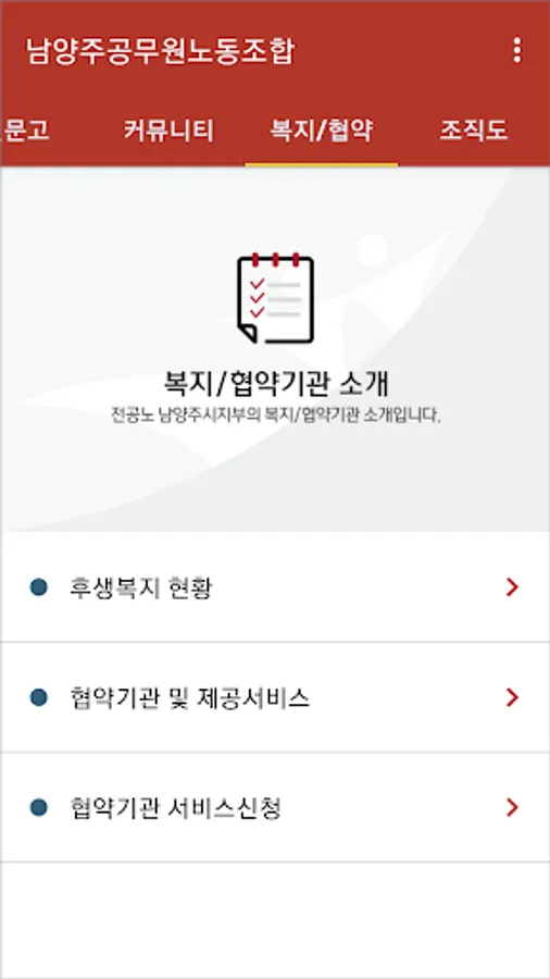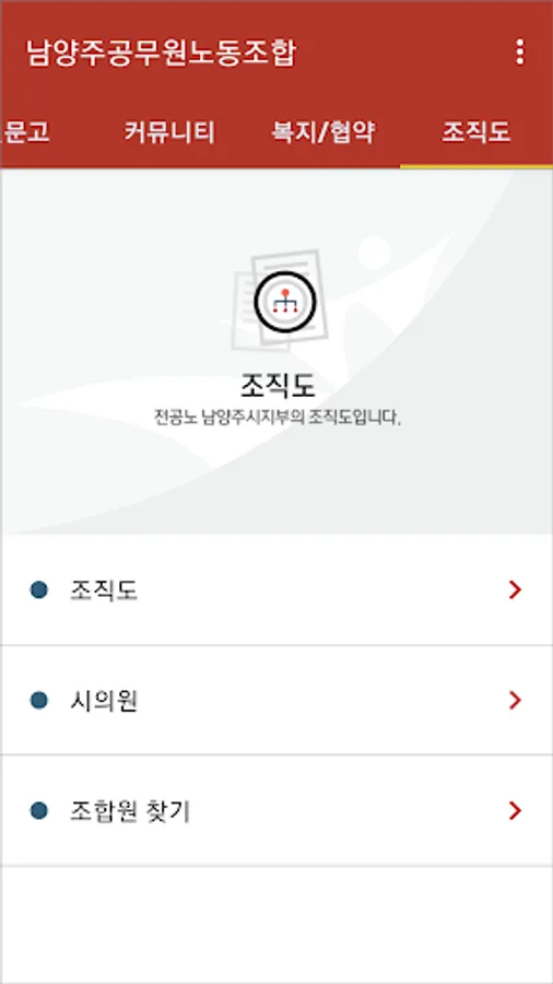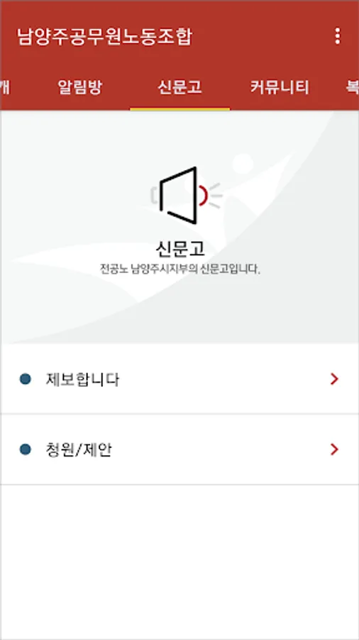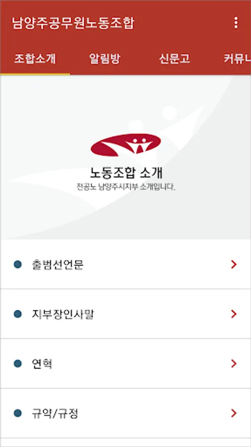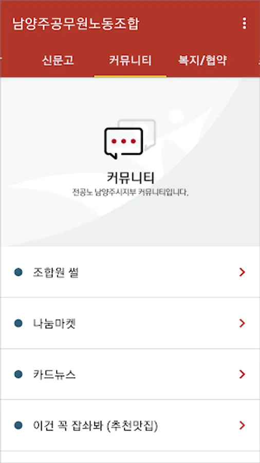 The composition of the app is composed of menus such as union introduction, notification room, newspaper, survey and voting, and community, so it is used as a space for communication of the union. Currently, it works only on smartphones of those who are registered as Namyangju Public Officials Labor Union.