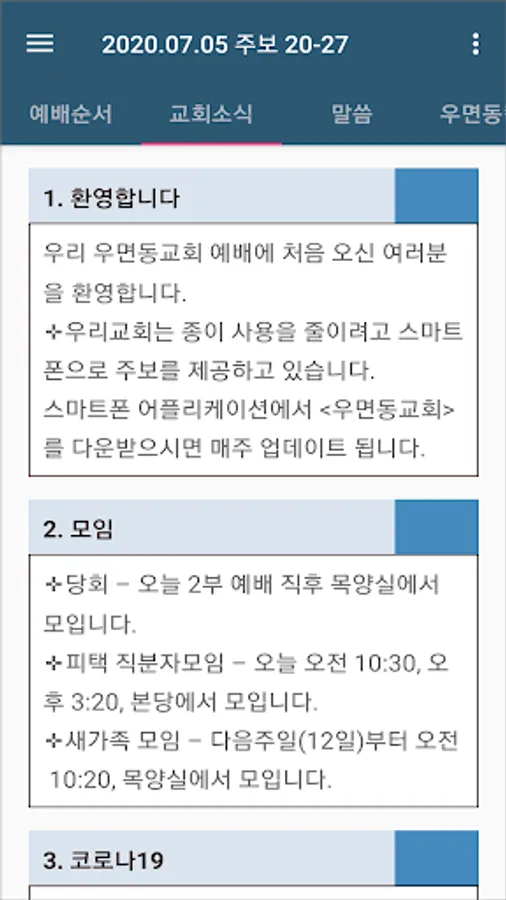 It is a smart news bulletin to replace paper bulletin that has been synonymous with waste of church. In the smart era, churches can use the smart devices to add convenience and efficiency to church work and church life and save resources and church finances. Umyeon-dong Church is a smart church that leads in this church innovation.