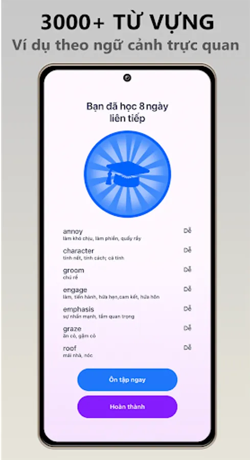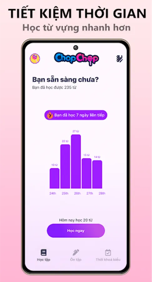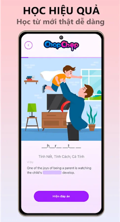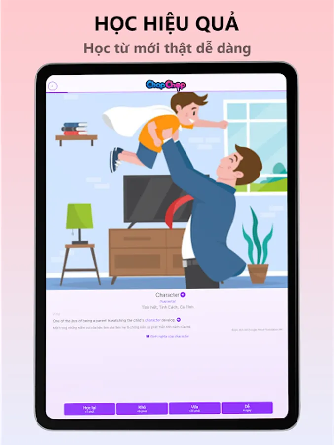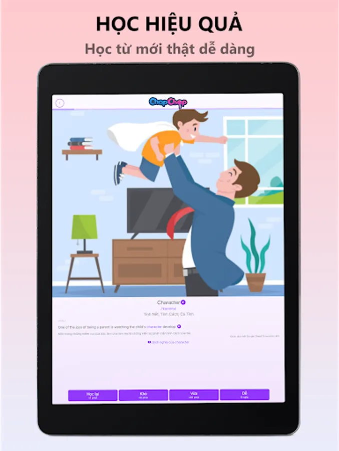 ChopChop helps you learn English with a rich vocabulary that includes phonetic transcriptions, examples, contexts, parts of speech, and pronunciation. You can easily absorb knowledge in the shortest possible time. ChopChop operates based on the spaced repetition learning method. Users choose the difficulty levels of HARD, MEDIUM, EASY, or AGAIN according to their ability. The app will calculate the golden time to review the vocabulary, helping you remember the words you have learned.