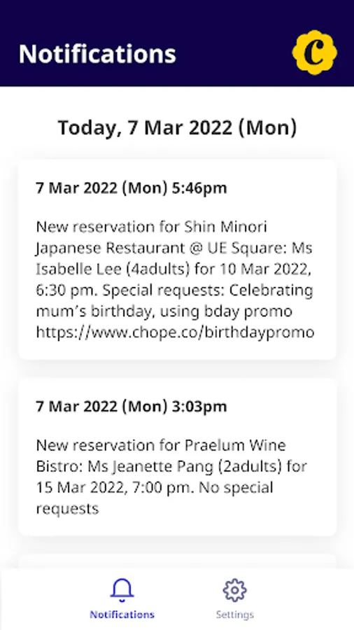 Exclusively for Chope merchants, our notifications app enables you to receive timely and convenient updates on new, updated or cancelled reservations for your restaurant. This app can be shared with all your staff members at no cost.