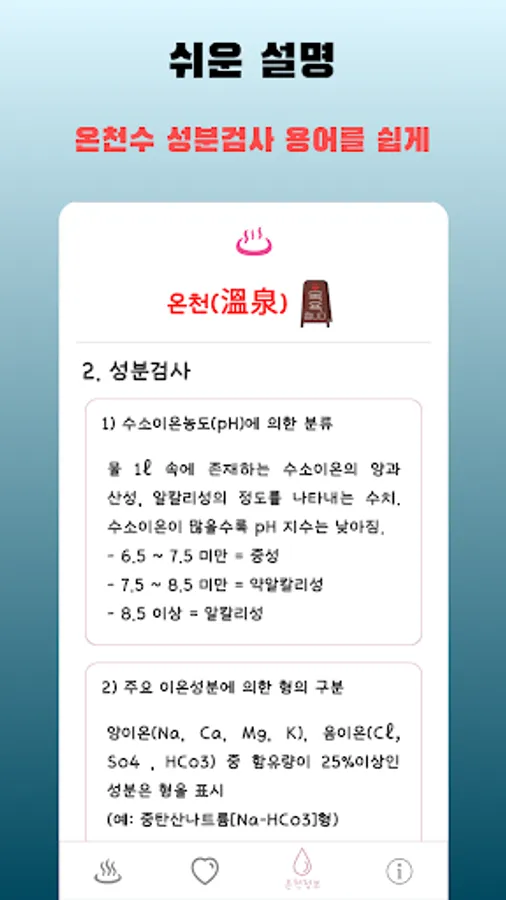 Based on the hot spring composition analysis table in the '22-year national hot spring status' published by the Ministry of the Interior and Safety, we provide information on the types of minerals and ions contained in hot springs and the hydrogen ion concentration (pH).
