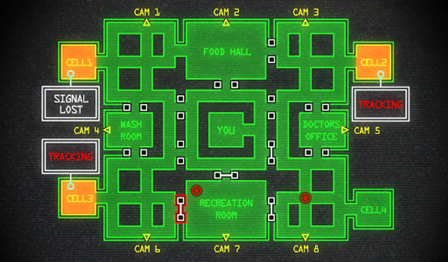 * An interactive map console where you can open and close doors around the asylum. Use the doors to prevent the patients reaching you!