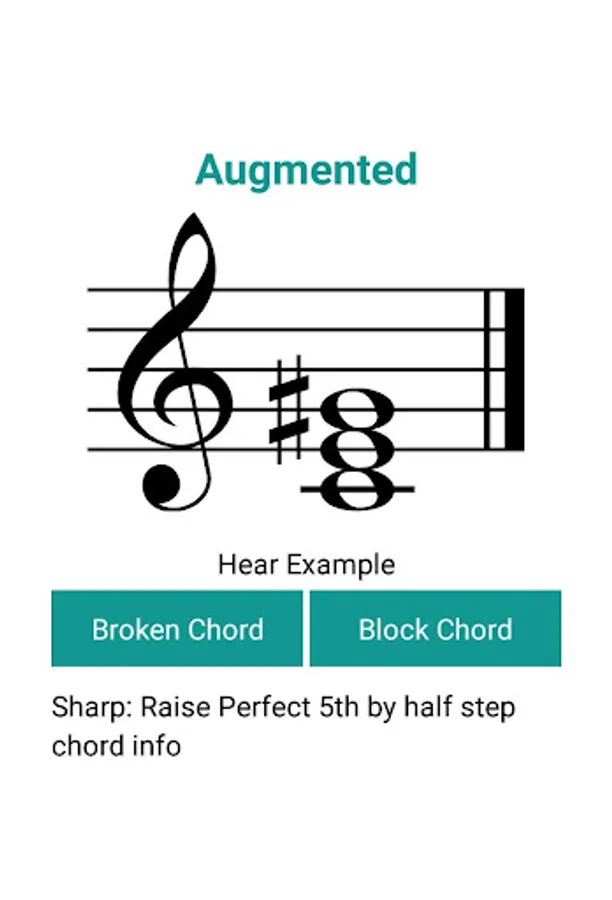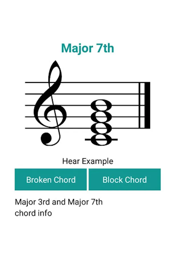 • Flashcard Mode teaches each chord by notating them on a staff, providing a written description, and two aural versions—each note of the chord at the same time (block chord) or one at a time (arpeggiated chord).