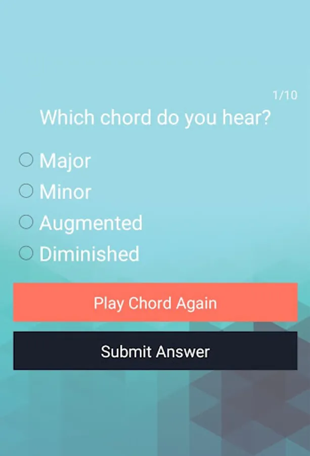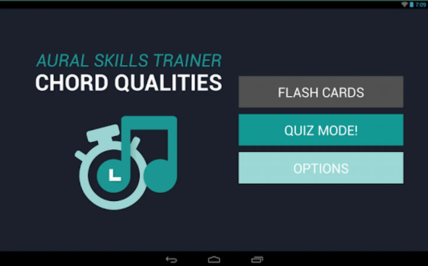 • Quiz Mode tests your knowledge of the chords in a multiple choice format. After practicing with flashcards, choose your level of difficulty (through the Options menu, see below) to determine how well you can hear each chord quality. The default level is the easiest level, which covers major, minor, augmented and diminished triads; the intermediate level adds 7th chords; the advanced level covers altered 7th chords and additional extended-tertian chords (9ths, 11ths, and 13ths); and finally, the Jazz/Popular mode covers chords unique to those genres. You can also select "All Chords" to get quizzed on all available chords.
