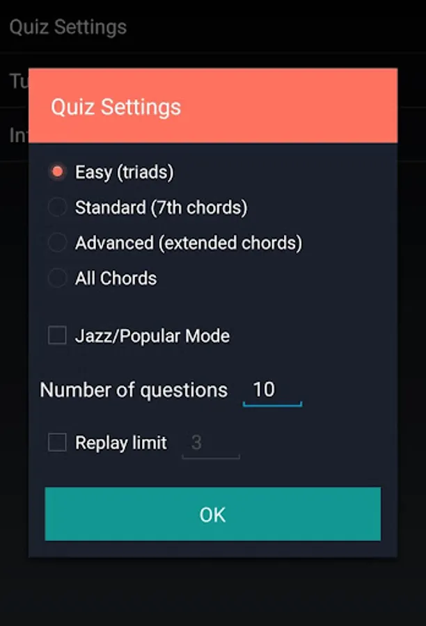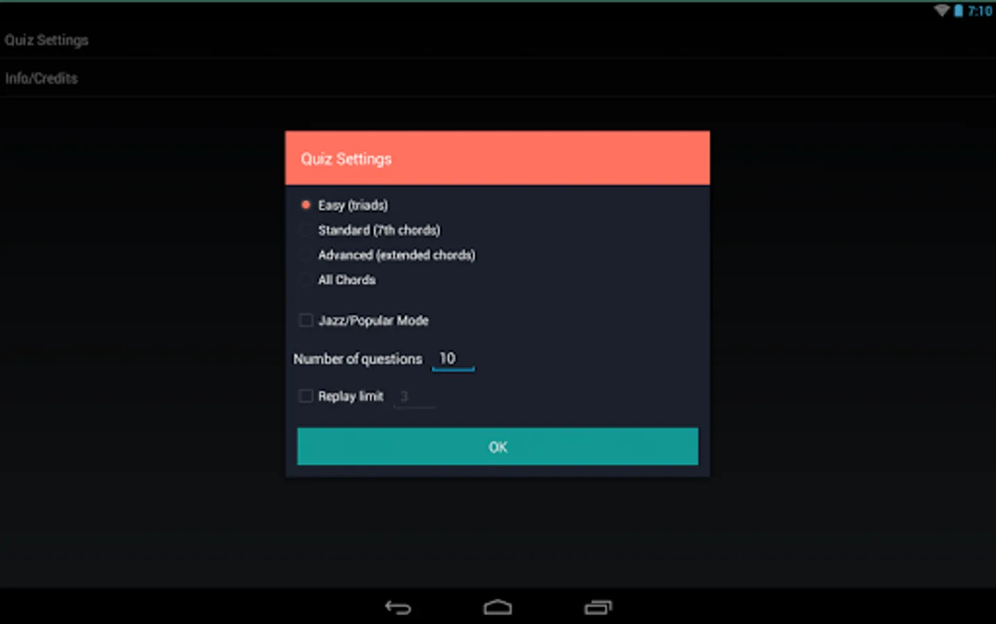 • The Options menu allows you to set limits for a customized quiz. The flexible quiz parameters include difficulty level, number of chords, and number of replays. Further, you can enable or disable the Jazz/Popular mode.