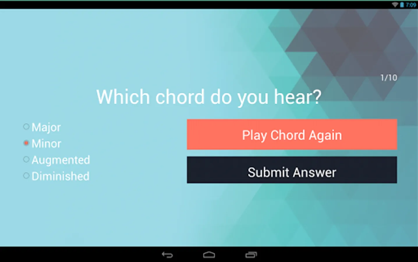 The Chord Trainer Free application provides an accessible and customizable mobile platform for both professional and aspiring musicians to fine tune their aural skills, specifically in the areas of chords and chord qualities. This version of the app has the same functionality as the paid one, but the free app includes ads. The three primary features of the app include the following:
