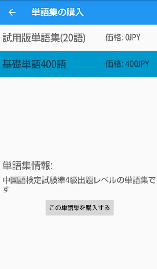 出題される単語は初期状態で20語、アプリ内で随時問題集を購入することで追加できます。