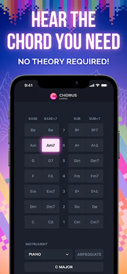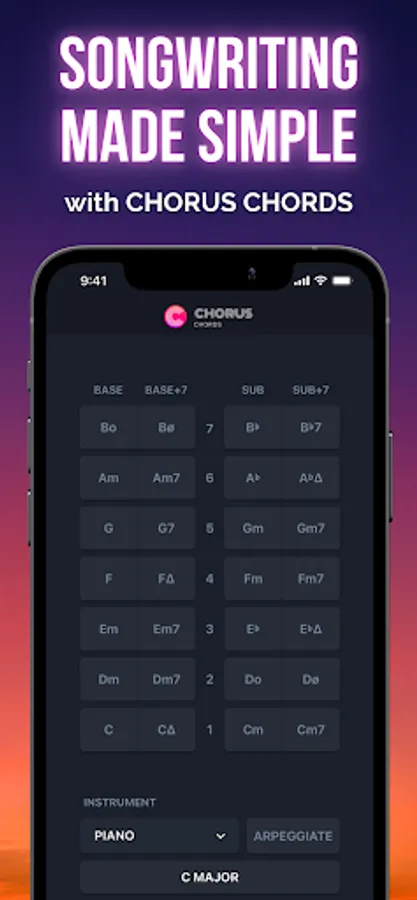Our simple chord system gives you access to the most popular chords used in modern music, and lets you play them with eight different instruments, all just with a single tap.