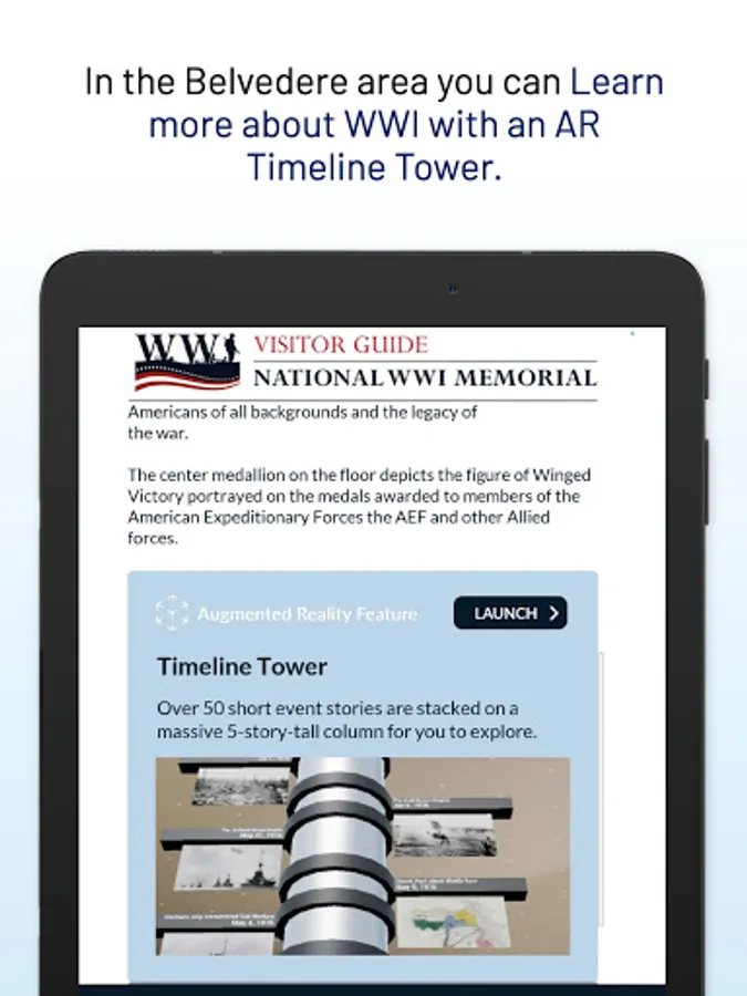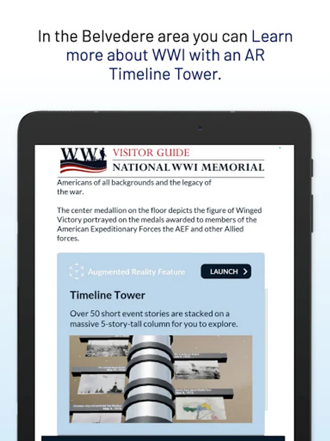 Each area has AR features that allow you to place objects, information, videos and more onto the grounds and surfaces of the memorial.